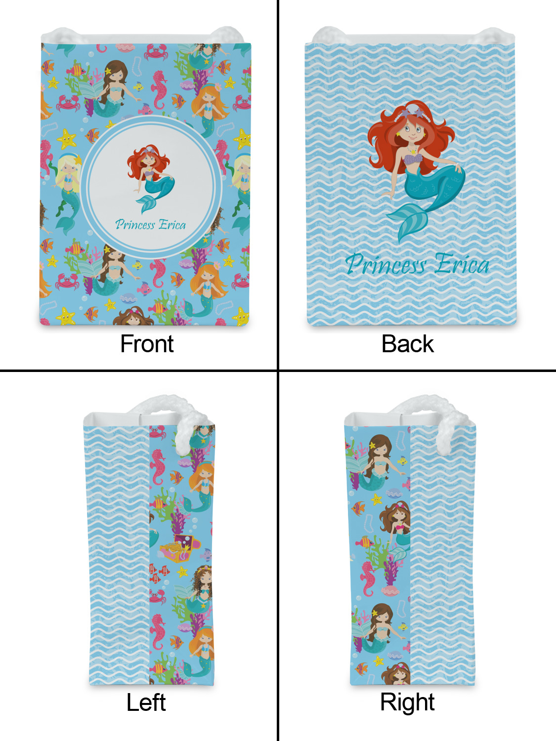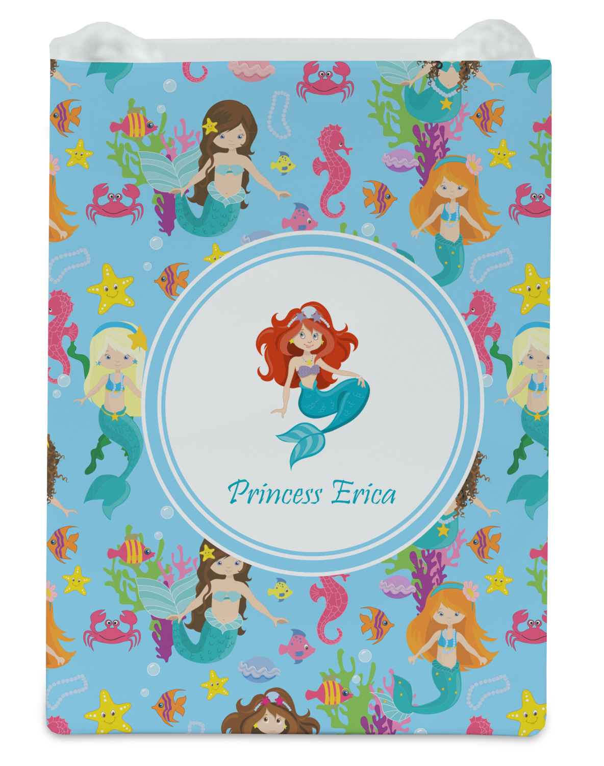 Love mermaids? This customize-able design has mermaids, sea creatures such as seahorses, fish, crabs, seahorses, oysters, seaweed and of course a treasure chest. We chose a soft blue to represent water for the background. You can change this to any color you desire. We have featured a mermaid in a round label, along with personalization under the mermaid graphic.