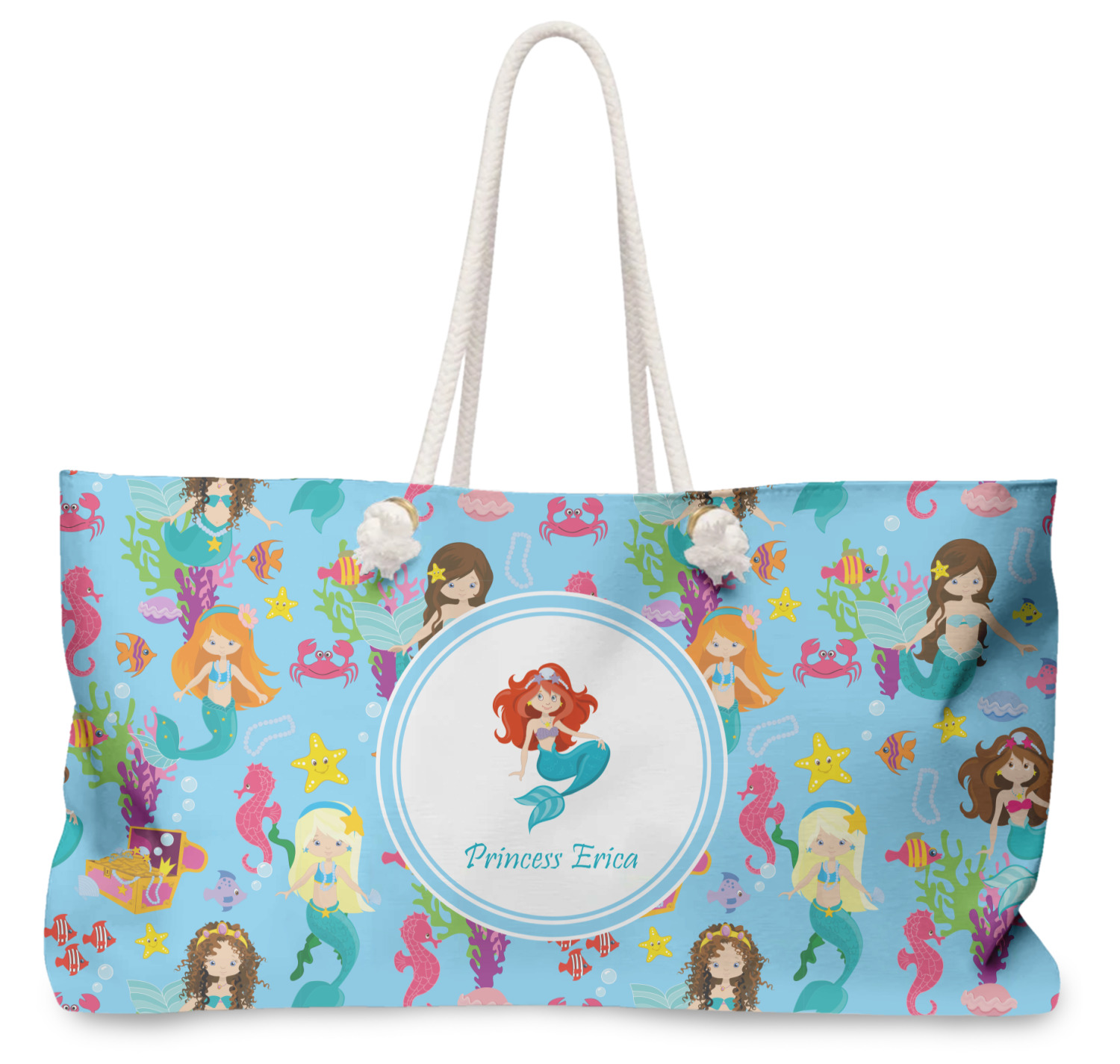 Love mermaids? This customize-able design has mermaids, sea creatures such as seahorses, fish, crabs, seahorses, oysters, seaweed and of course a treasure chest. We chose a soft blue to represent water for the background. You can change this to any color you desire. We have featured a mermaid in a round label, along with personalization under the mermaid graphic.
