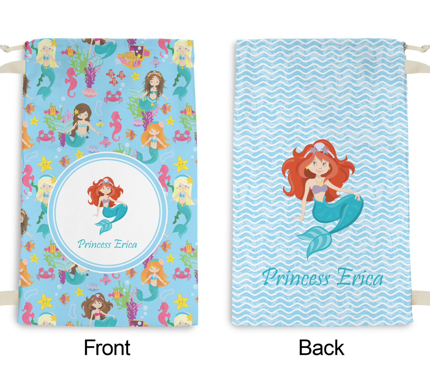 Love mermaids? This customize-able design has mermaids, sea creatures such as seahorses, fish, crabs, seahorses, oysters, seaweed and of course a treasure chest. We chose a soft blue to represent water for the background. You can change this to any color you desire. We have featured a mermaid in a round label, along with personalization under the mermaid graphic.