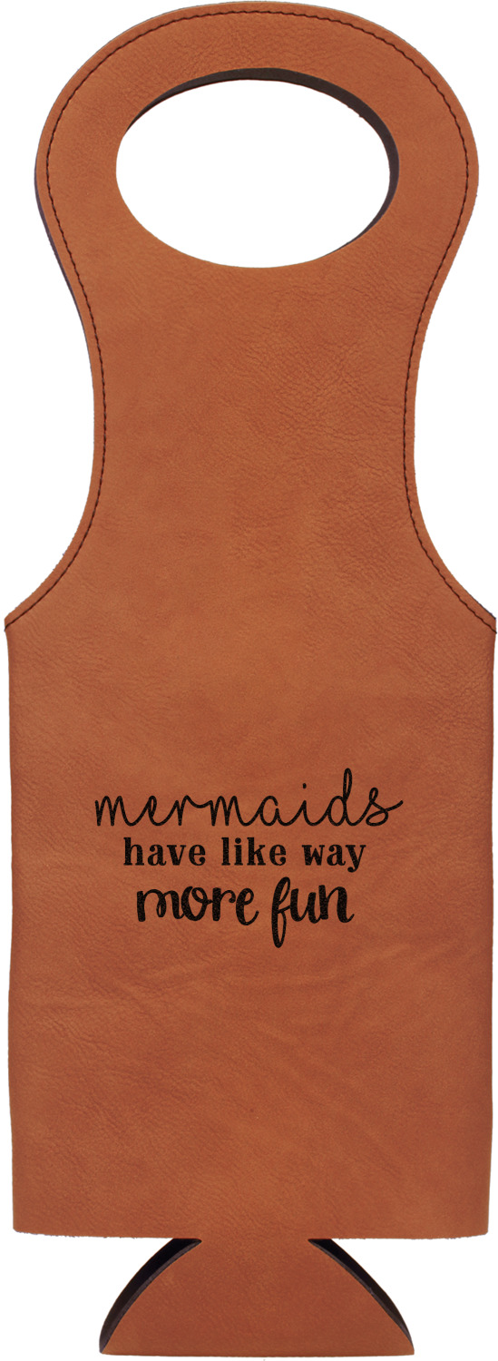 This wine carrier is made from a stunning leatherette, in a cognac-brown color. Strong, black stitching lines the sides of your wine bottle bag and provides extra durability. The interior is lined with a padded, black material to allow for a snug fit once your bottle is placed inside. At the top of this wine gift bag, you'll find two oval shaped handles that elegantly complements the rest of the bag's style. We provide you with the option of laser-engraving the front, or the front and back of your new personalized wine bag!