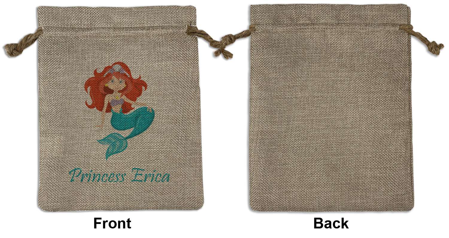 We sell our Burlap Gift Bags in 3 variant sized bags. Made with burlap polyester, each personalized bag can be secured with a twine drawstring pull. Your custom design is available to print on one side or both sides - completely up to you! The sizes of the bags measure approximately 4.5" x 6.5" for the smallest size, 6.5" x 8.0" for the medium size, and 6.5" x 13.5" for the large-sized bag.