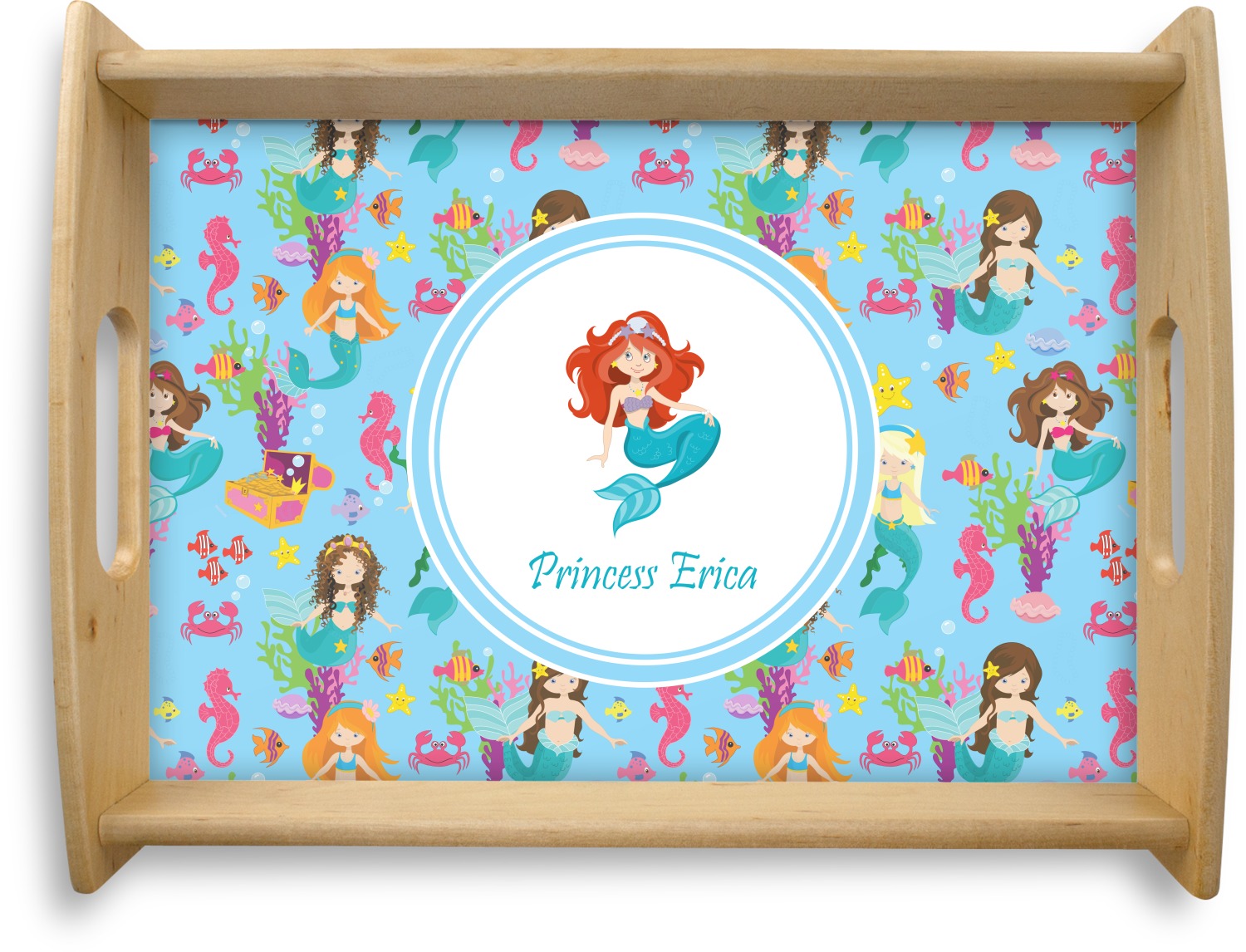 Love mermaids? This customize-able design has mermaids, sea creatures such as seahorses, fish, crabs, seahorses, oysters, seaweed and of course a treasure chest. We chose a soft blue to represent water for the background. You can change this to any color you desire. We have featured a mermaid in a round label, along with personalization under the mermaid graphic.