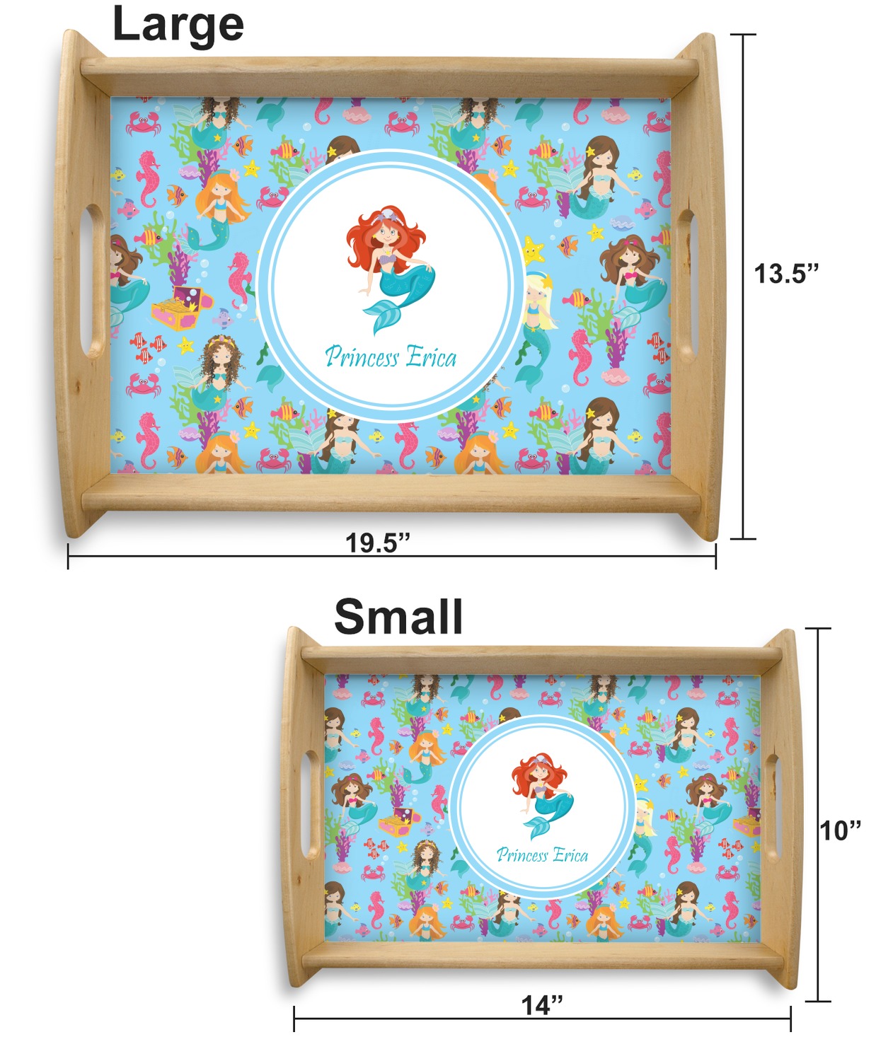 This serving tray with handles features square edges and two rounded sides, creating a very modern look. Each side is fabricated from a beautifully cut, natural wood. The bottom of the interior of the tray displays your customized design in bright, vibrant color. The tray is sold in both a black color and a natural wood look. Each variation of the wood serving tray has two sizes: Small, which is 14" x 10" x 2.25", and Large, which is 19.5" x 13.5" x 2.75".