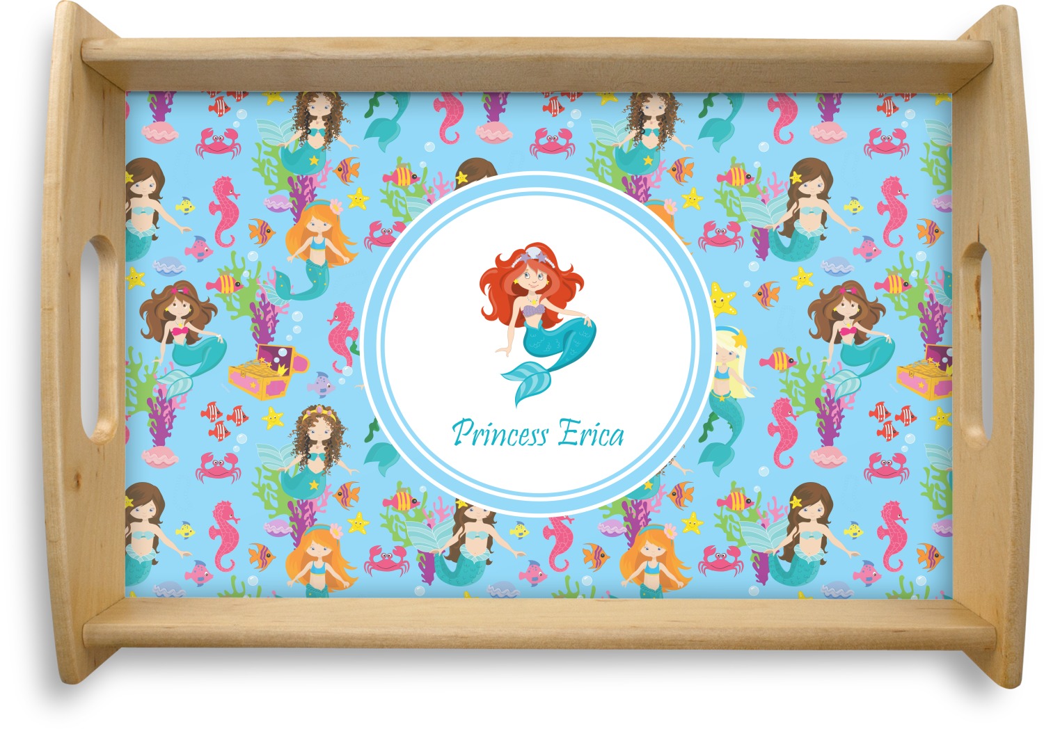 Love mermaids? This customize-able design has mermaids, sea creatures such as seahorses, fish, crabs, seahorses, oysters, seaweed and of course a treasure chest. We chose a soft blue to represent water for the background. You can change this to any color you desire. We have featured a mermaid in a round label, along with personalization under the mermaid graphic.
