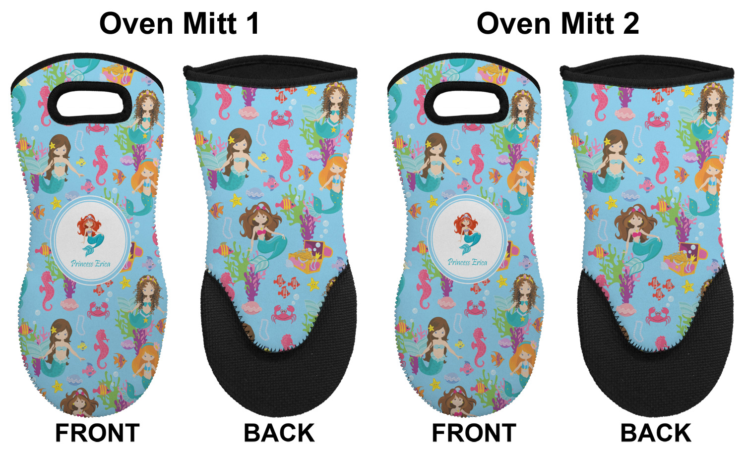 These heat resistant gloves are made entirely of a durable neoprene; the front features a softer texture, while the palm's side has a textured surface, meant to handle heat up to 500 degrees Fahrenheit. Thick, heavy duty stitching connects the two sides. A small, oval cutout appears on the front, and can be used to hang and store the mitt. Your personalization appears on the front, and the upper part of the back of the mitt. The style of these oven mitts are suitable for both the right and left hand, depending on your needs. If you need one for each hand, be sure to order two!