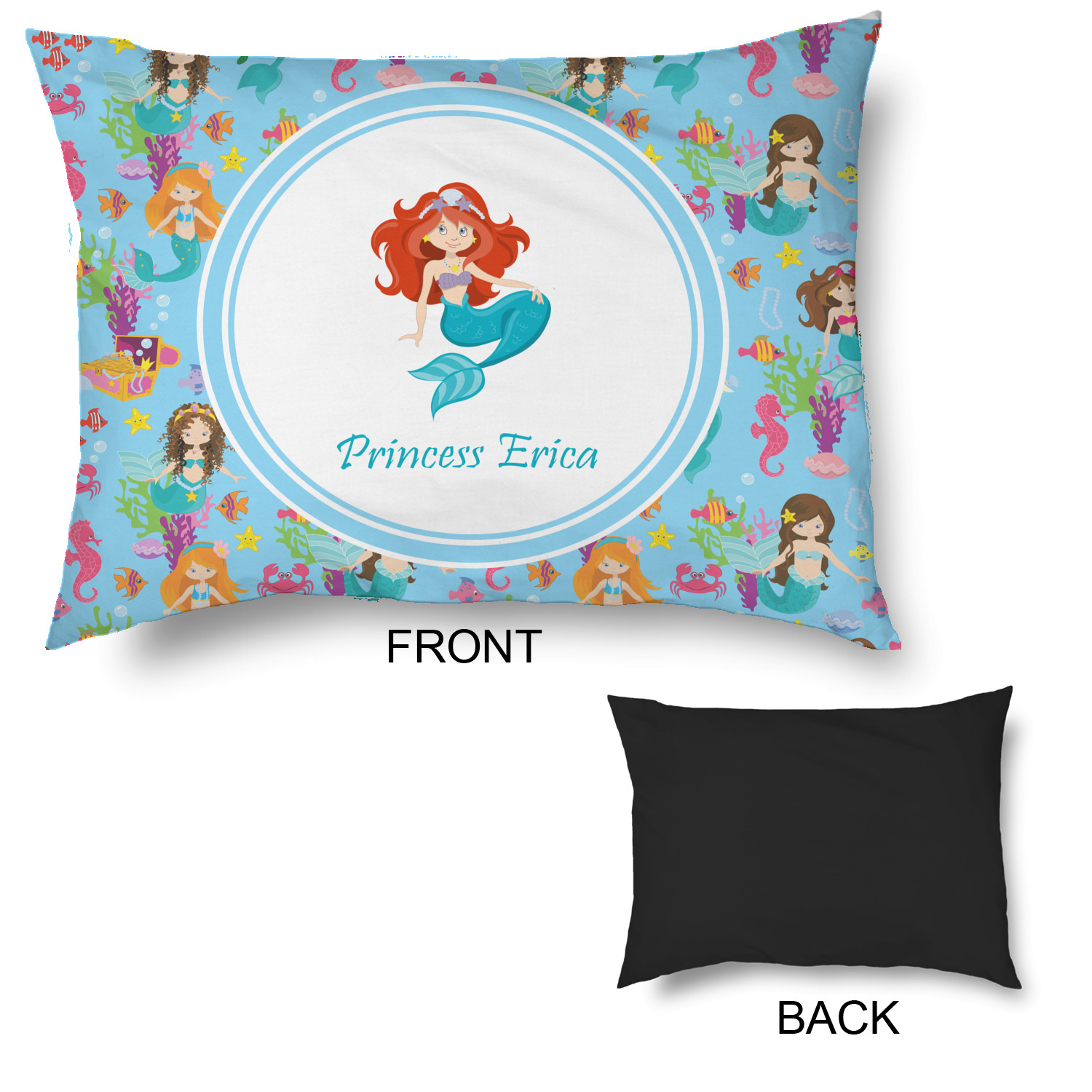 Love mermaids? This customize-able design has mermaids, sea creatures such as seahorses, fish, crabs, seahorses, oysters, seaweed and of course a treasure chest. We chose a soft blue to represent water for the background. You can change this to any color you desire. We have featured a mermaid in a round label, along with personalization under the mermaid graphic.