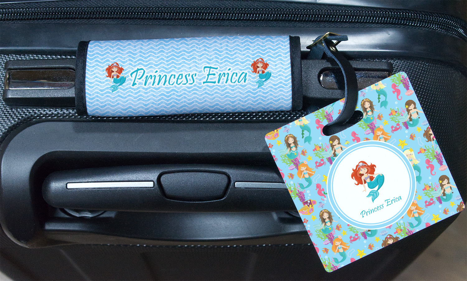 These personalized bag tags are sold in a variety of shapes, so that you may find the product that meets your vision exactly. We sell a round luggage tag, which measures at approximately 4" x 4". Our square luggage tag is about 3.5" x 3.5", while our rectangular version is 2.75" x 4 ".