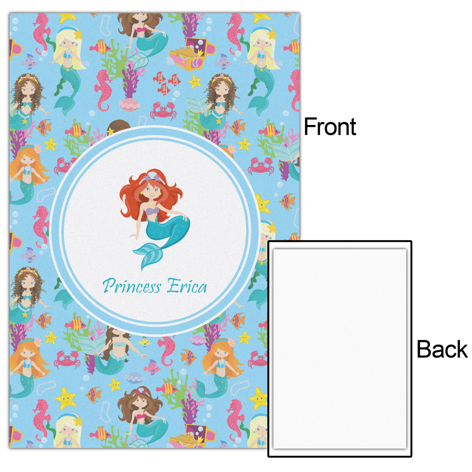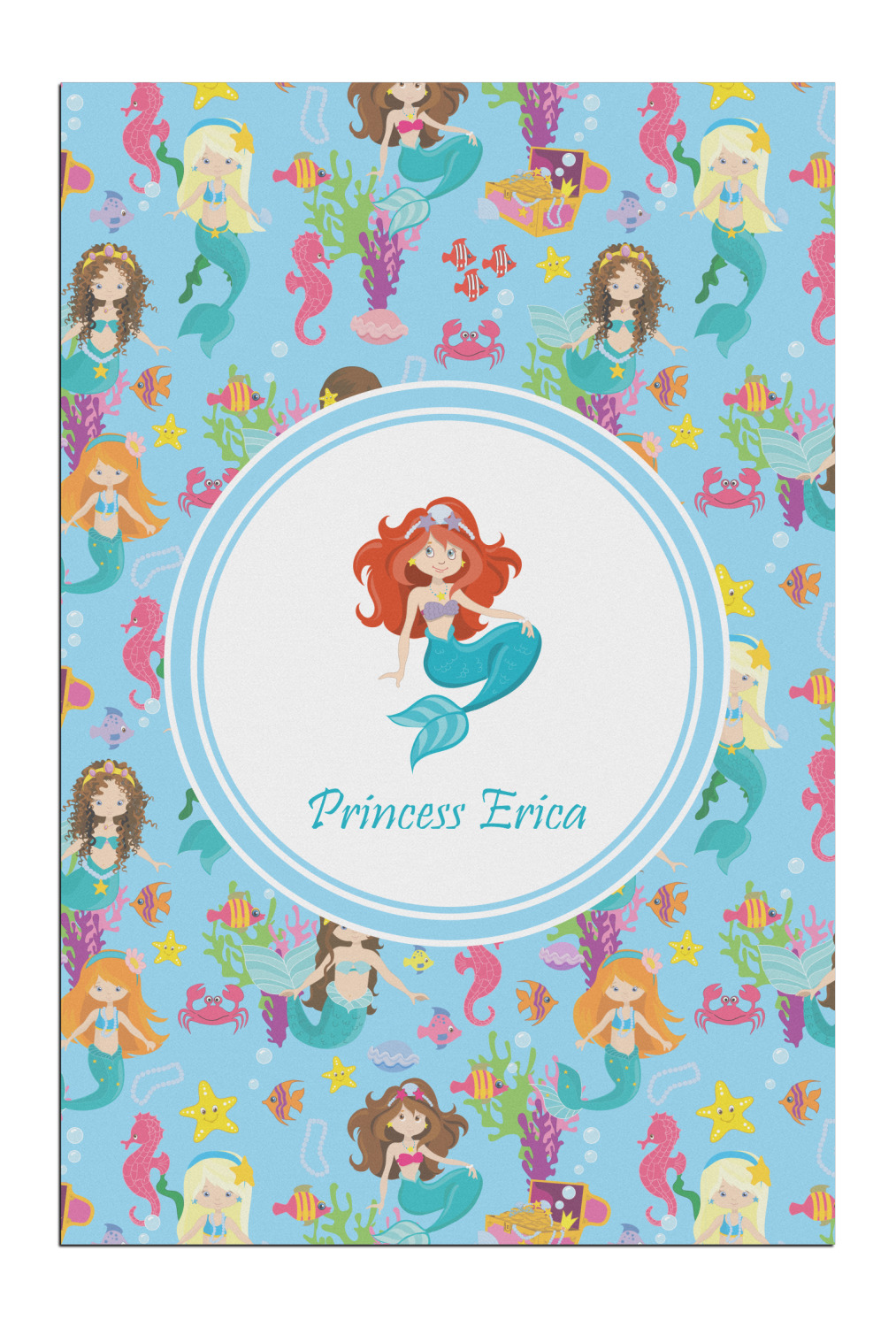 Love mermaids? This customize-able design has mermaids, sea creatures such as seahorses, fish, crabs, seahorses, oysters, seaweed and of course a treasure chest. We chose a soft blue to represent water for the background. You can change this to any color you desire. We have featured a mermaid in a round label, along with personalization under the mermaid graphic.