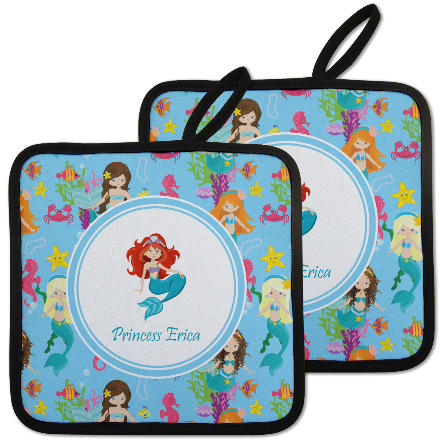 Love mermaids? This customize-able design has mermaids, sea creatures such as seahorses, fish, crabs, seahorses, oysters, seaweed and of course a treasure chest. We chose a soft blue to represent water for the background. You can change this to any color you desire. We have featured a mermaid in a round label, along with personalization under the mermaid graphic.