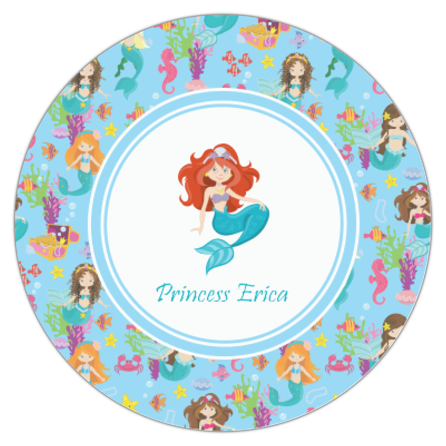 Love mermaids? This customize-able design has mermaids, sea creatures such as seahorses, fish, crabs, seahorses, oysters, seaweed and of course a treasure chest. We chose a soft blue to represent water for the background. You can change this to any color you desire. We have featured a mermaid in a round label, along with personalization under the mermaid graphic.