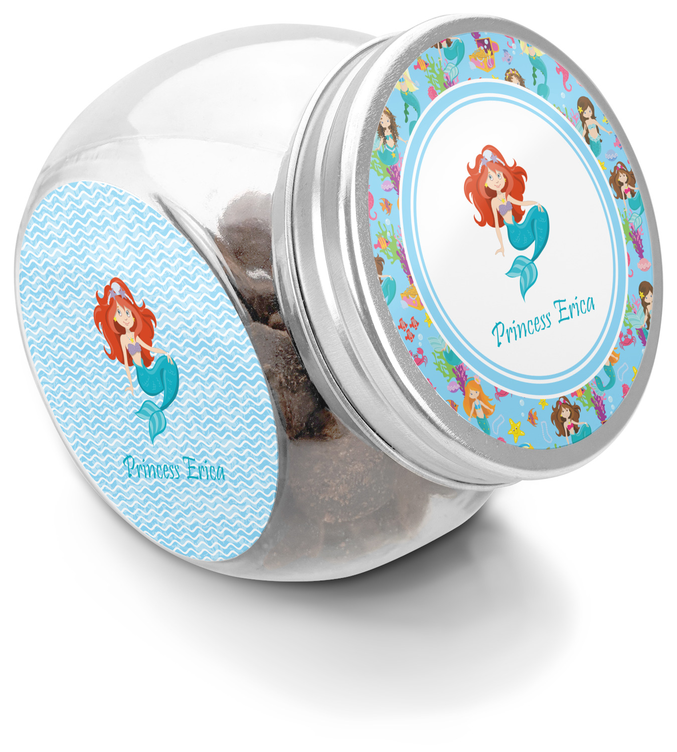 Love mermaids? This customize-able design has mermaids, sea creatures such as seahorses, fish, crabs, seahorses, oysters, seaweed and of course a treasure chest. We chose a soft blue to represent water for the background. You can change this to any color you desire. We have featured a mermaid in a round label, along with personalization under the mermaid graphic.