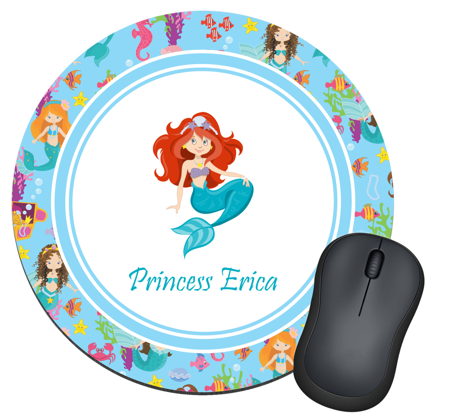 Love mermaids? This customize-able design has mermaids, sea creatures such as seahorses, fish, crabs, seahorses, oysters, seaweed and of course a treasure chest. We chose a soft blue to represent water for the background. You can change this to any color you desire. We have featured a mermaid in a round label, along with personalization under the mermaid graphic.
