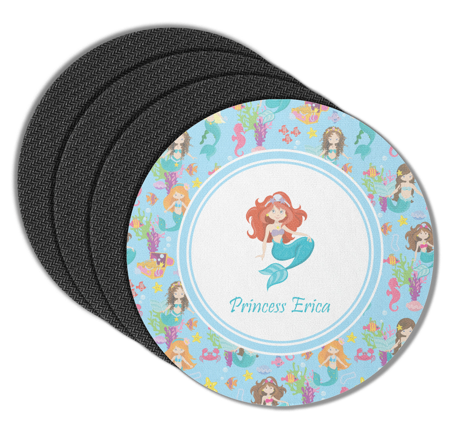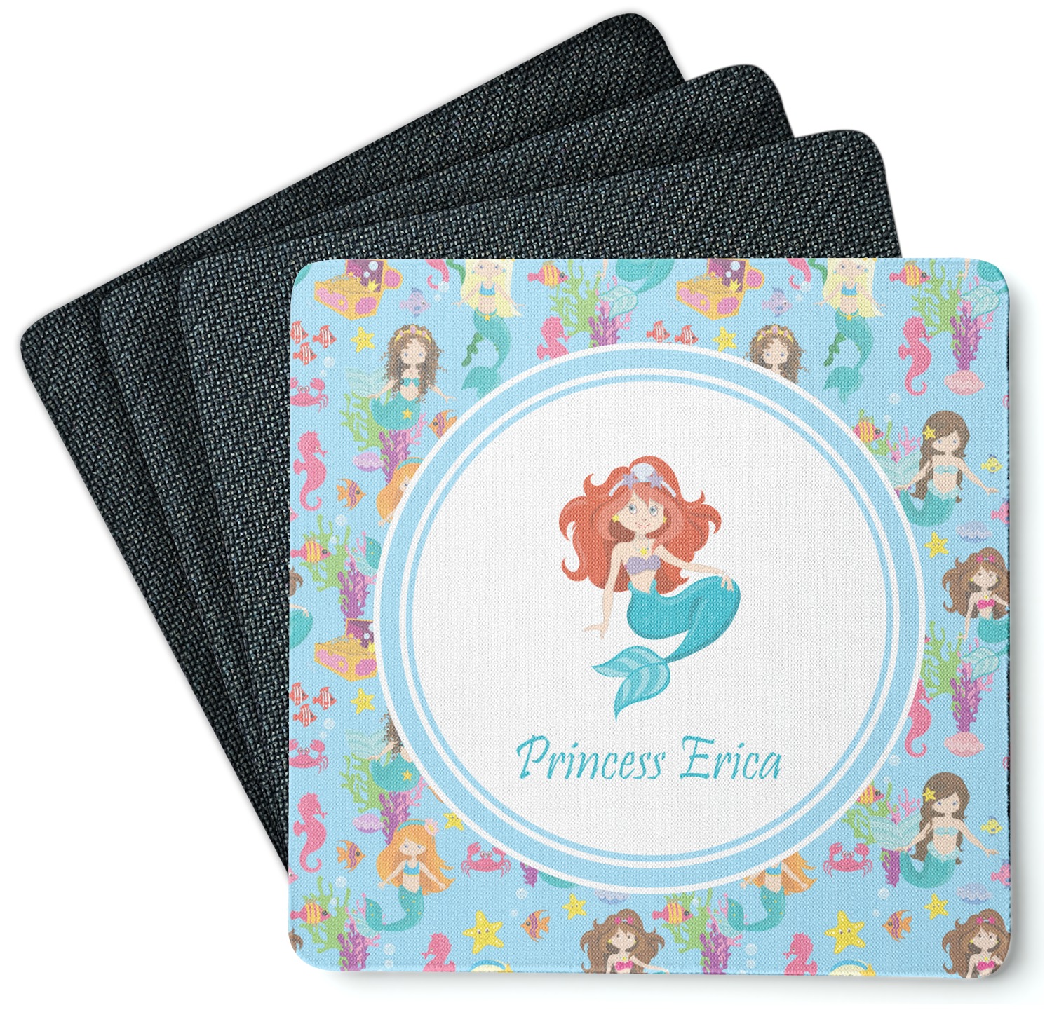 Love mermaids? This customize-able design has mermaids, sea creatures such as seahorses, fish, crabs, seahorses, oysters, seaweed and of course a treasure chest. We chose a soft blue to represent water for the background. You can change this to any color you desire. We have featured a mermaid in a round label, along with personalization under the mermaid graphic.