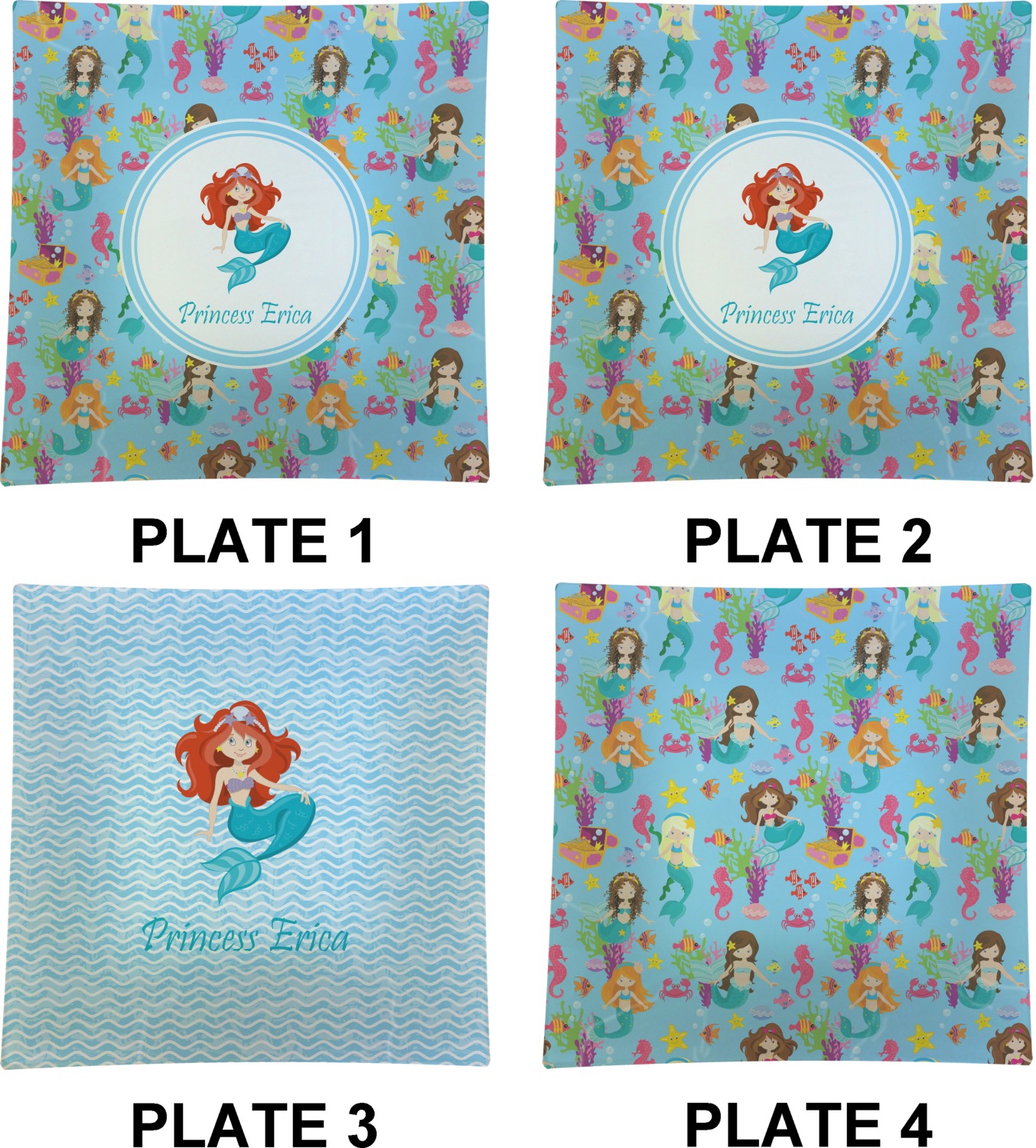 Love mermaids? This customize-able design has mermaids, sea creatures such as seahorses, fish, crabs, seahorses, oysters, seaweed and of course a treasure chest. We chose a soft blue to represent water for the background. You can change this to any color you desire. We have featured a mermaid in a round label, along with personalization under the mermaid graphic.
