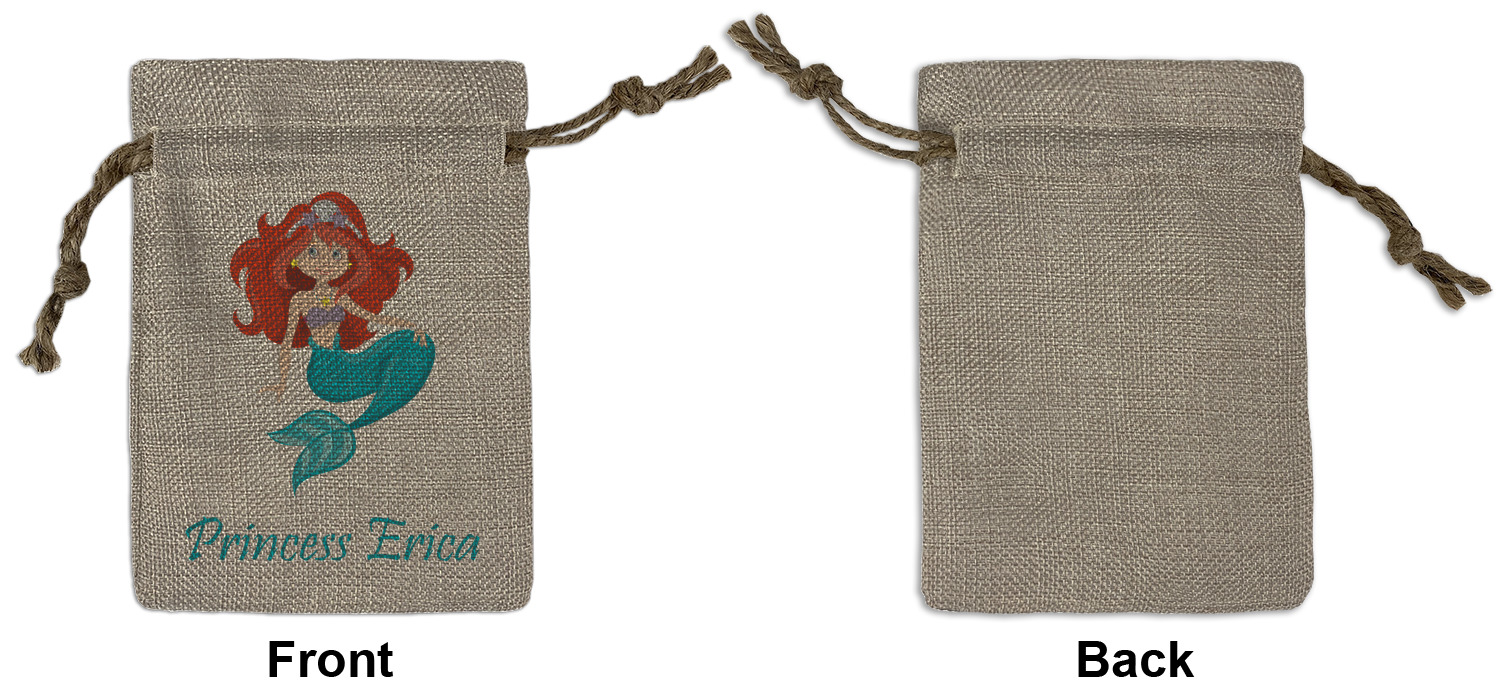 We sell our Burlap Gift Bags in 3 variant sized bags. Made with burlap polyester, each personalized bag can be secured with a twine drawstring pull. Your custom design is available to print on one side or both sides - completely up to you! The sizes of the bags measure approximately 4.5" x 6.5" for the smallest size, 6.5" x 8.0" for the medium size, and 6.5" x 13.5" for the large-sized bag.