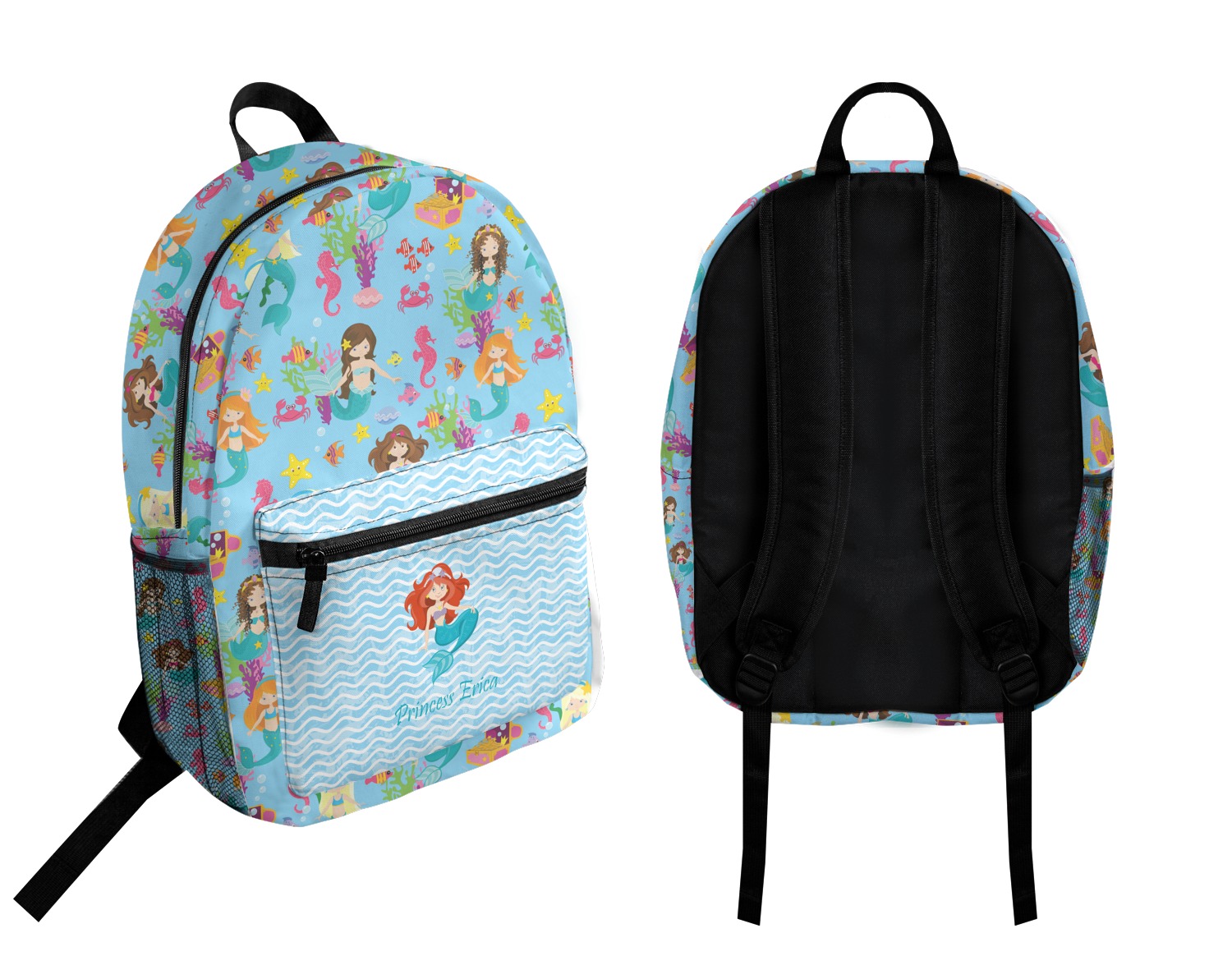 Love mermaids? This customize-able design has mermaids, sea creatures such as seahorses, fish, crabs, seahorses, oysters, seaweed and of course a treasure chest. We chose a soft blue to represent water for the background. You can change this to any color you desire. We have featured a mermaid in a round label, along with personalization under the mermaid graphic.