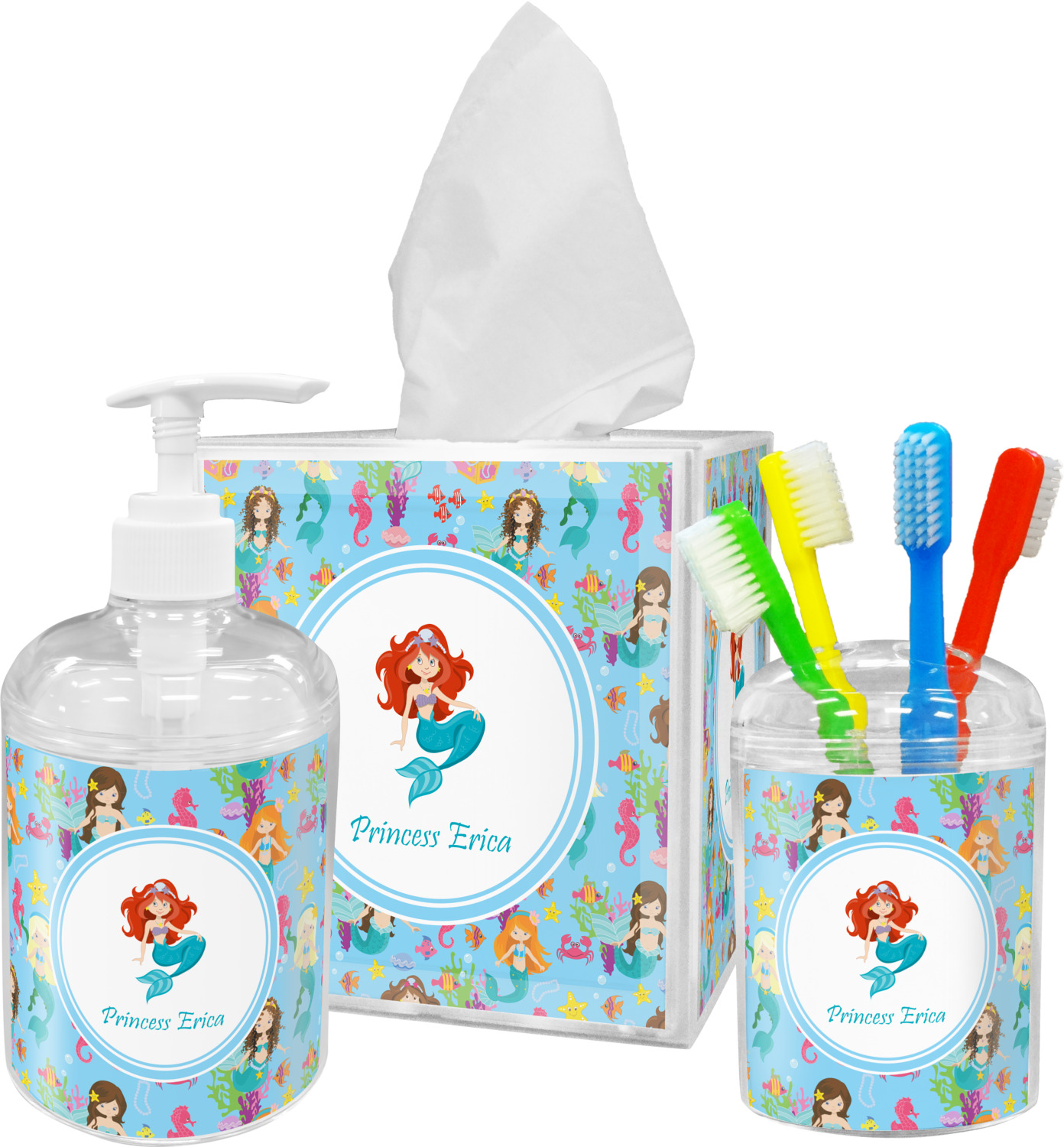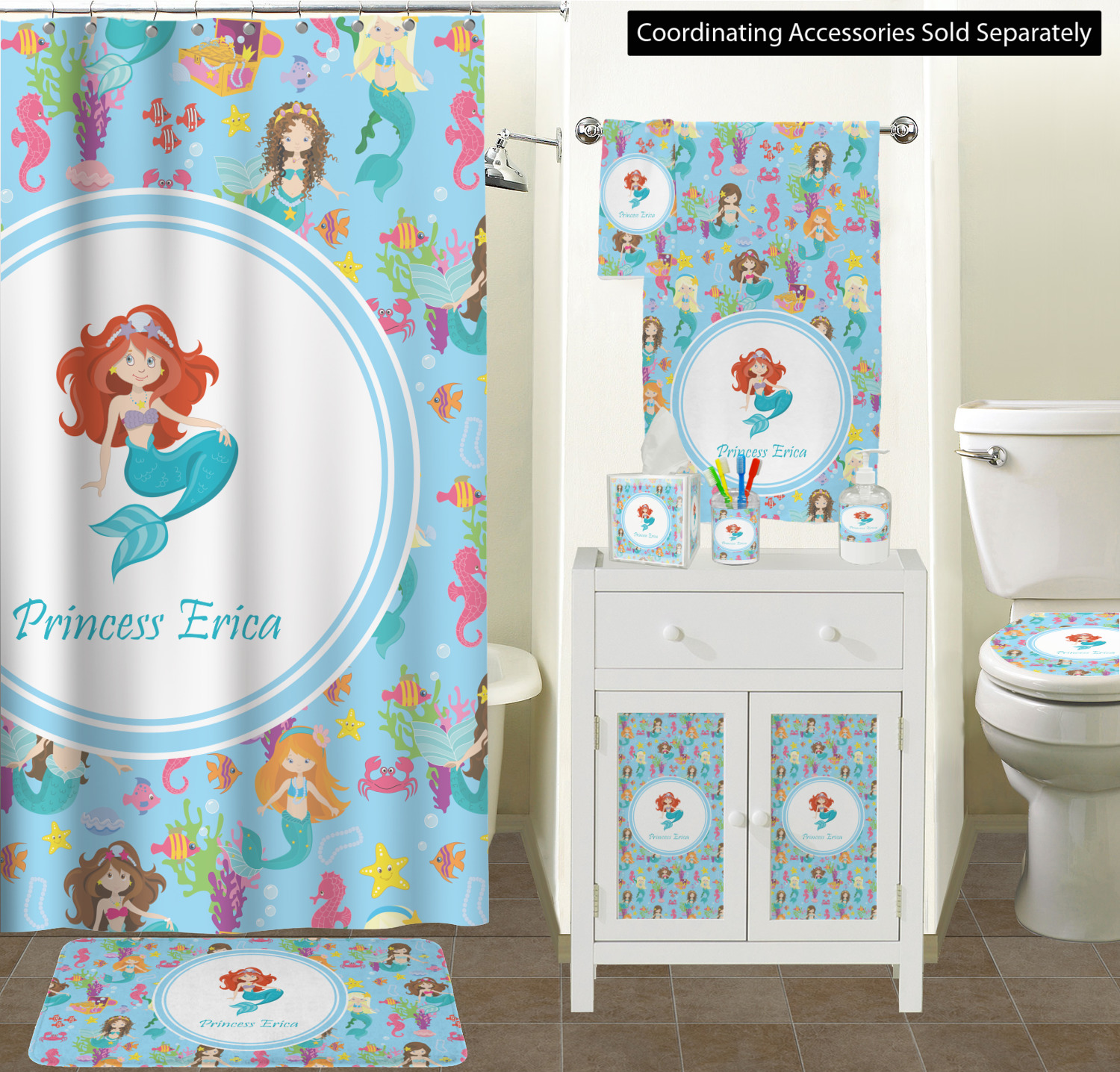 Love mermaids? This customize-able design has mermaids, sea creatures such as seahorses, fish, crabs, seahorses, oysters, seaweed and of course a treasure chest. We chose a soft blue to represent water for the background. You can change this to any color you desire. We have featured a mermaid in a round label, along with personalization under the mermaid graphic.