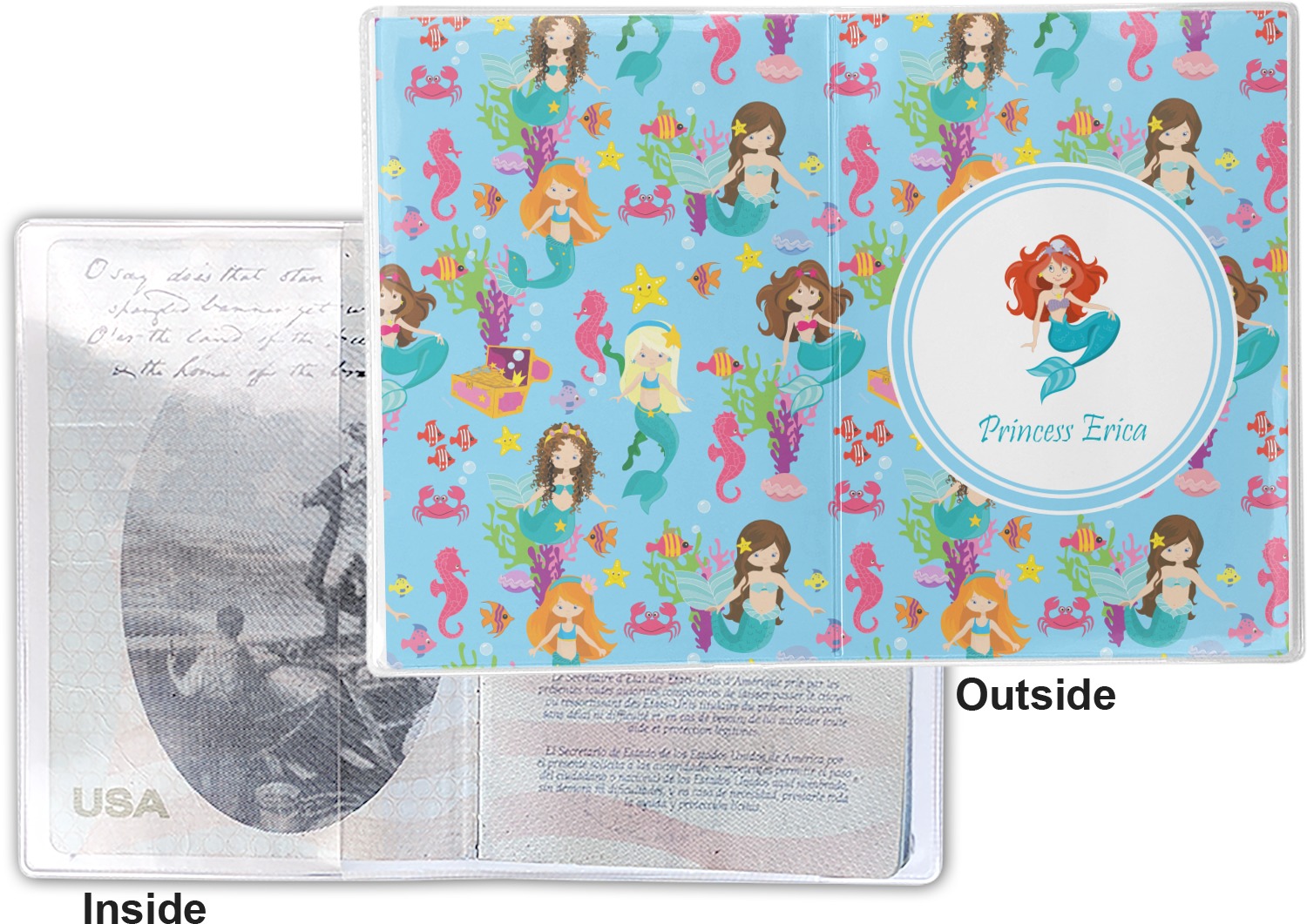 This cover is made of a sturdy clear vinyl with a personalized vinyl insert inside. There is a large and a small pocket on either side to hold the covers of your passport easily and firmly. The passport holder is approximately 7.5" x 5.25", the perfect size to snugly fit your passport. This slim cover is the perfect way to protect your passport without being one more bulky item you have to carry.