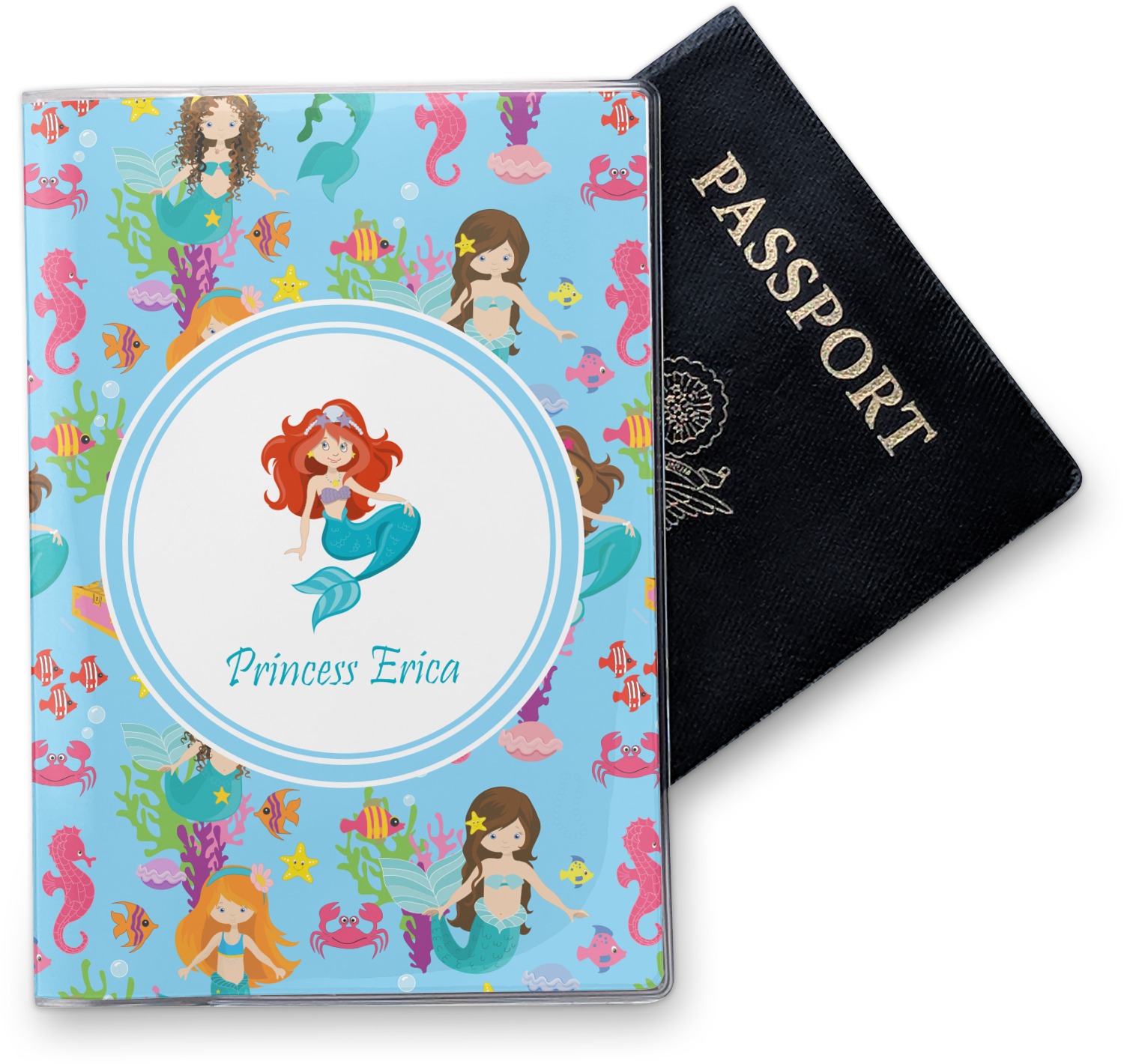 Love mermaids? This customize-able design has mermaids, sea creatures such as seahorses, fish, crabs, seahorses, oysters, seaweed and of course a treasure chest. We chose a soft blue to represent water for the background. You can change this to any color you desire. We have featured a mermaid in a round label, along with personalization under the mermaid graphic.