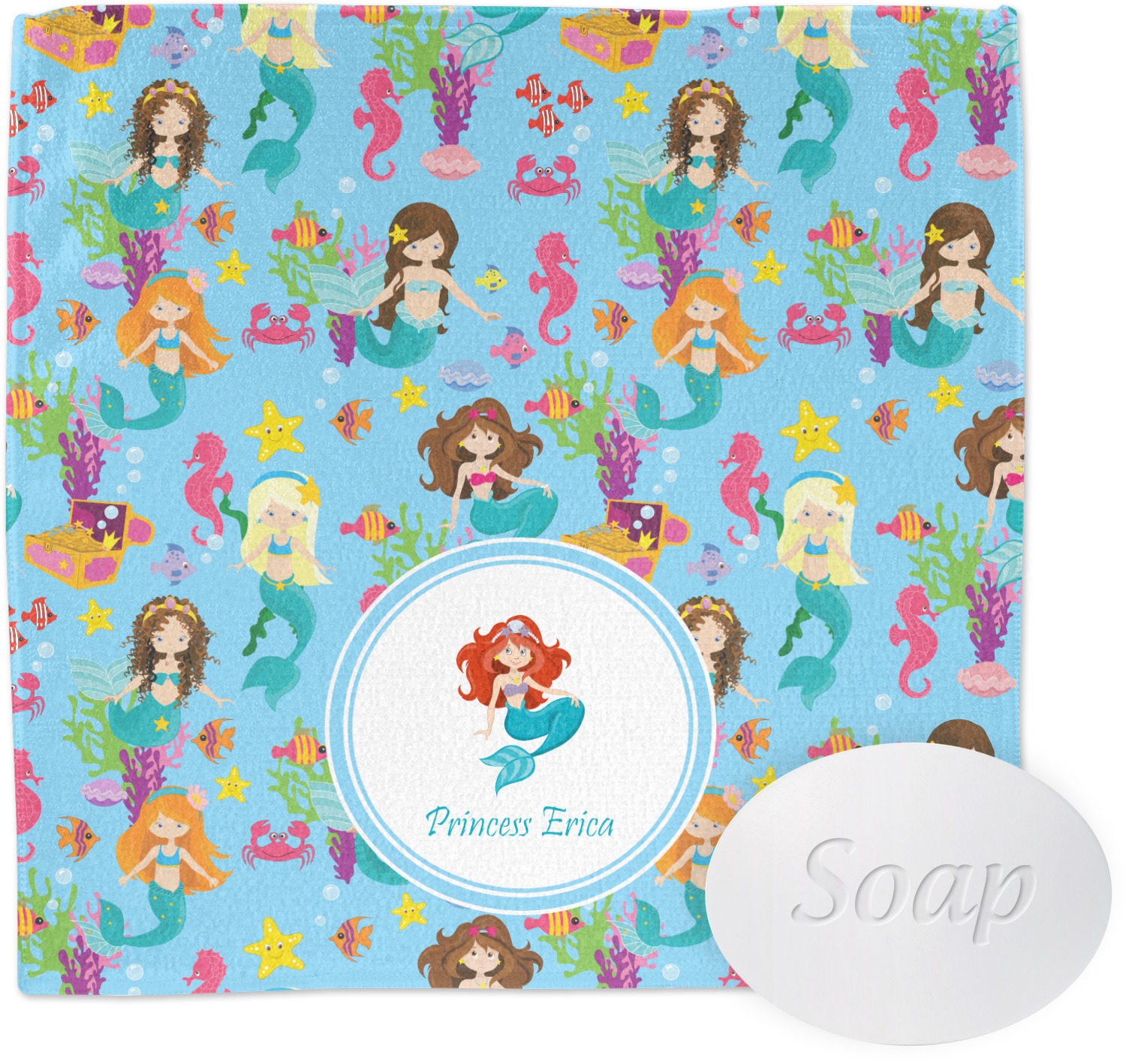 Love mermaids? This customize-able design has mermaids, sea creatures such as seahorses, fish, crabs, seahorses, oysters, seaweed and of course a treasure chest. We chose a soft blue to represent water for the background. You can change this to any color you desire. We have featured a mermaid in a round label, along with personalization under the mermaid graphic.