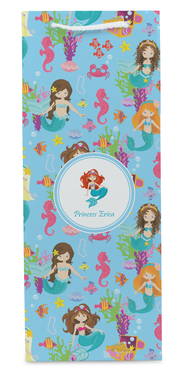 Love mermaids? This customize-able design has mermaids, sea creatures such as seahorses, fish, crabs, seahorses, oysters, seaweed and of course a treasure chest. We chose a soft blue to represent water for the background. You can change this to any color you desire. We have featured a mermaid in a round label, along with personalization under the mermaid graphic.