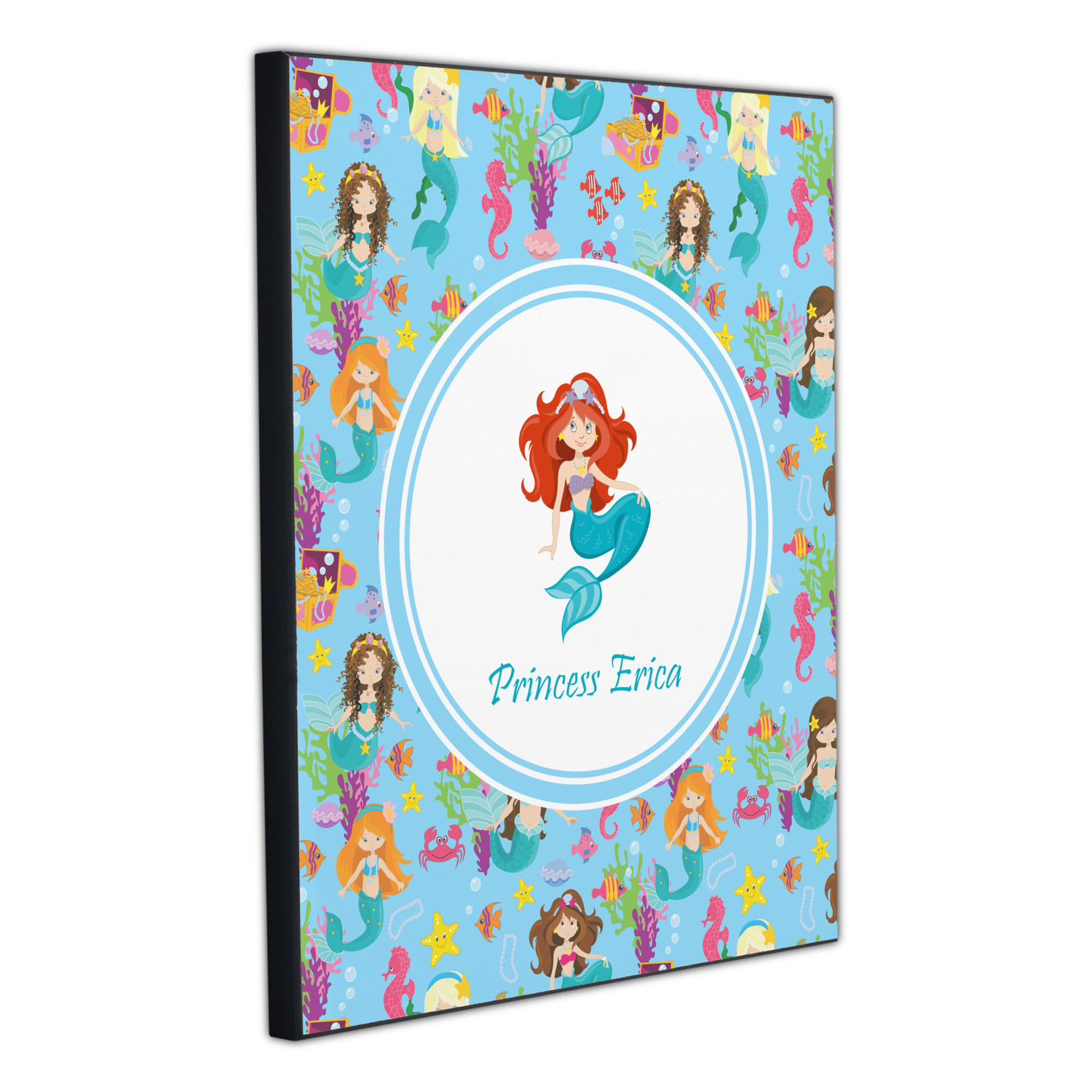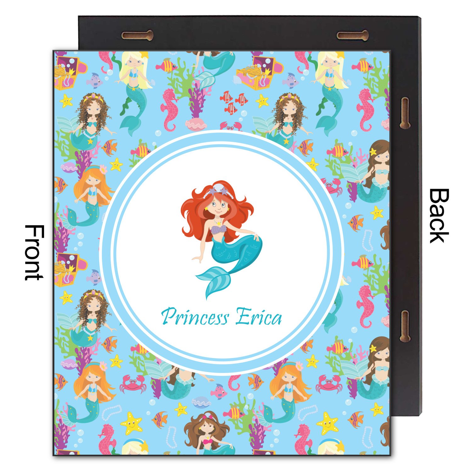 Love mermaids? This customize-able design has mermaids, sea creatures such as seahorses, fish, crabs, seahorses, oysters, seaweed and of course a treasure chest. We chose a soft blue to represent water for the background. You can change this to any color you desire. We have featured a mermaid in a round label, along with personalization under the mermaid graphic.