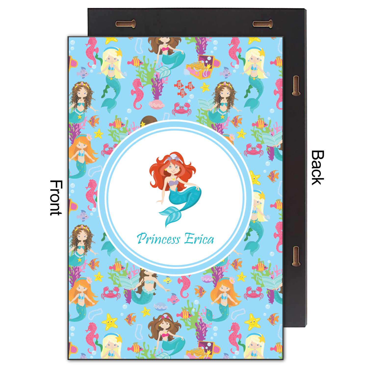 Love mermaids? This customize-able design has mermaids, sea creatures such as seahorses, fish, crabs, seahorses, oysters, seaweed and of course a treasure chest. We chose a soft blue to represent water for the background. You can change this to any color you desire. We have featured a mermaid in a round label, along with personalization under the mermaid graphic.