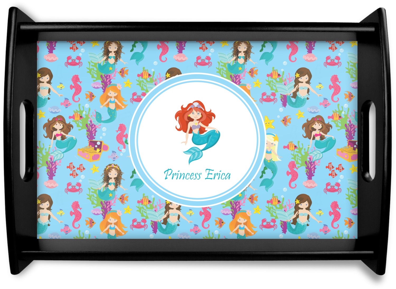 Love mermaids? This customize-able design has mermaids, sea creatures such as seahorses, fish, crabs, seahorses, oysters, seaweed and of course a treasure chest. We chose a soft blue to represent water for the background. You can change this to any color you desire. We have featured a mermaid in a round label, along with personalization under the mermaid graphic.
