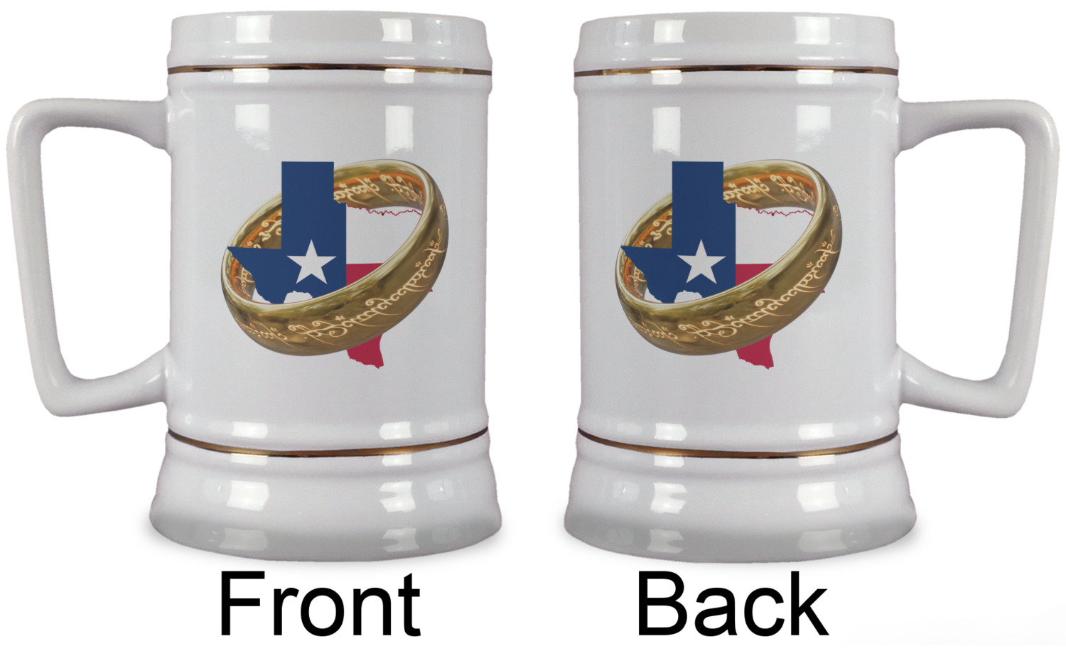 The beer steins are white in color, made from the highest quality ceramic and are approx. 5.5" tall with a top diameter of 3.5" and a bottom diameter of 4". They also have a D shaped handle that gives a modern touch to the classic European shaped beer stein. The beer steins also feature elegant gold pin stripes on the top and the bottom.