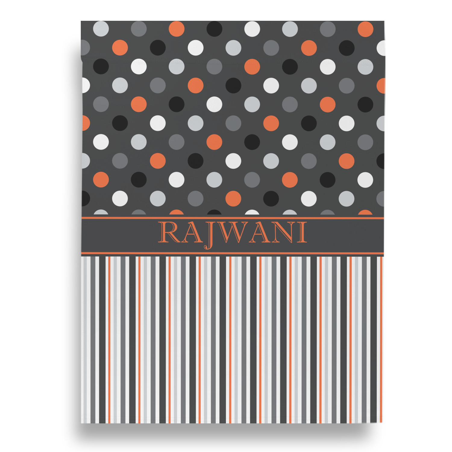 A wide charcoal gray band trimmed in orange divides the pattern to add interested and is used to highlight the slate grey square label. Add personalization of your choice.