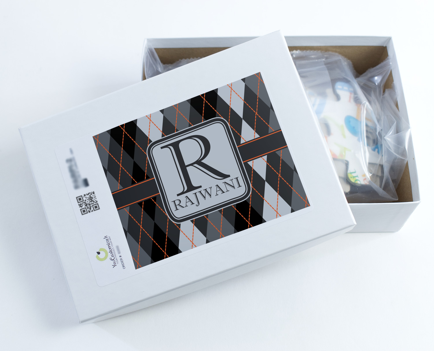 A wide charcoal gray band trimmed in orange divides the pattern to add interested and is used to highlight the slate grey square label. Add personalization of your choice.