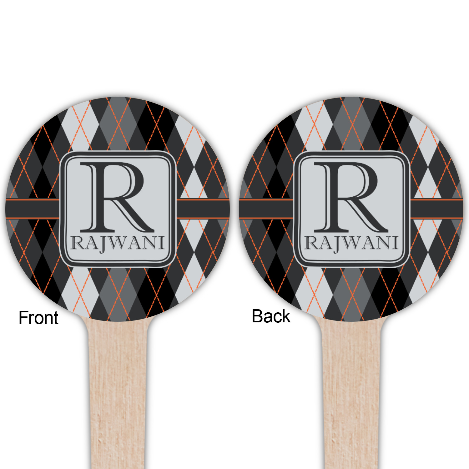 A wide charcoal gray band trimmed in orange divides the pattern to add interested and is used to highlight the slate grey square label. Add personalization of your choice.