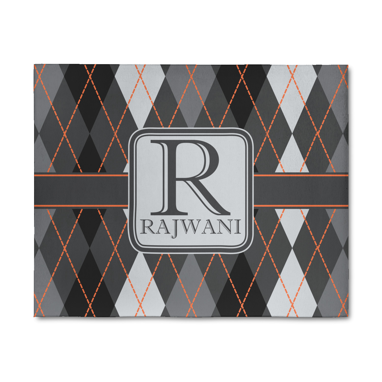 A wide charcoal gray band trimmed in orange divides the pattern to add interested and is used to highlight the slate grey square label. Add personalization of your choice.