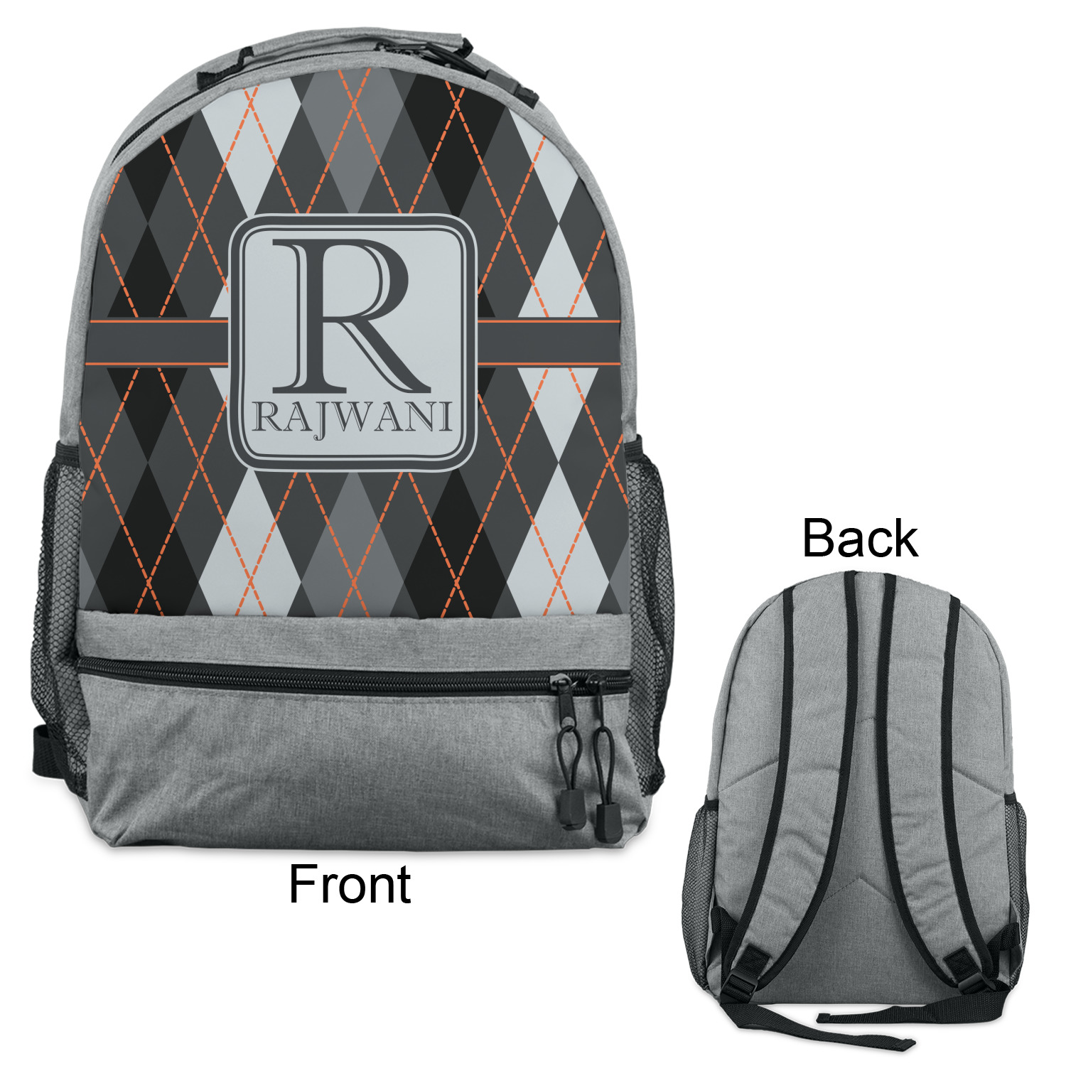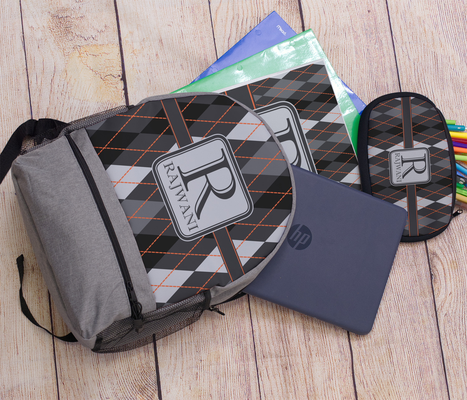 A wide charcoal gray band trimmed in orange divides the pattern to add interested and is used to highlight the slate grey square label. Add personalization of your choice.