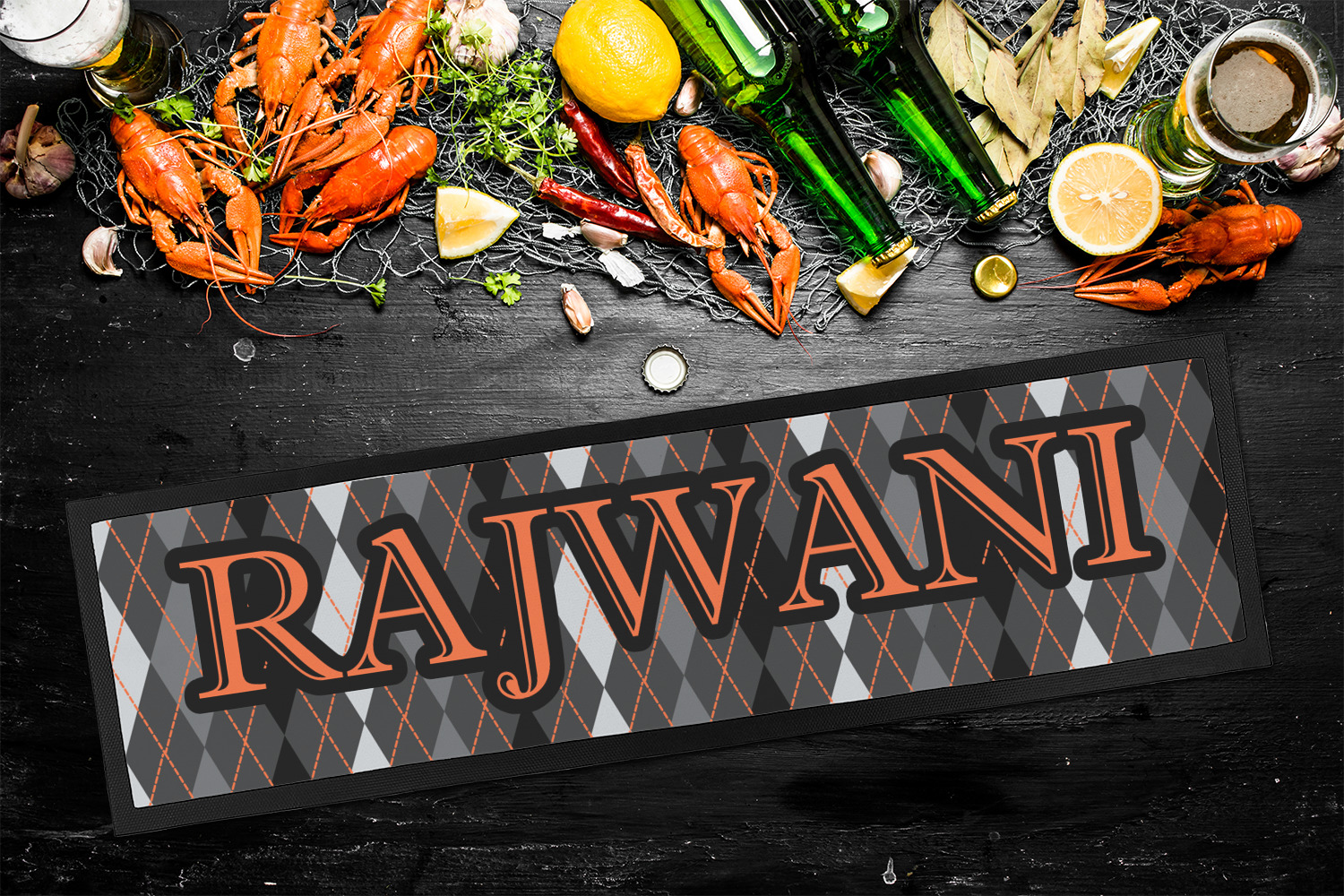 A wide charcoal gray band trimmed in orange divides the pattern to add interested and is used to highlight the slate grey square label. Add personalization of your choice.
