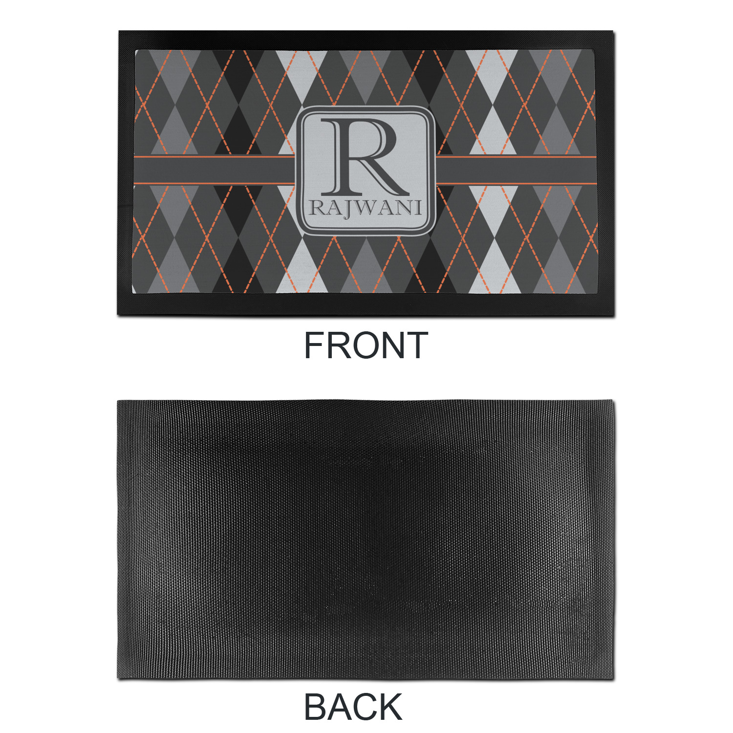 A wide charcoal gray band trimmed in orange divides the pattern to add interested and is used to highlight the slate grey square label. Add personalization of your choice.