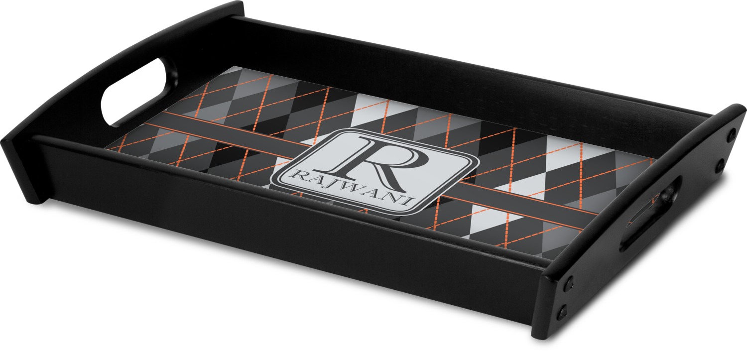 This serving tray with handles features square edges and two rounded sides, creating a very modern look. Each side is fabricated from a beautifully cut, natural wood. The bottom of the interior of the tray displays your customized design in bright, vibrant color. The tray is sold in both a black color and a natural wood look. Each variation of the wood serving tray has two sizes: Small, which is 14" x 10" x 2.25", and Large, which is 19.5" x 13.5" x 2.75".