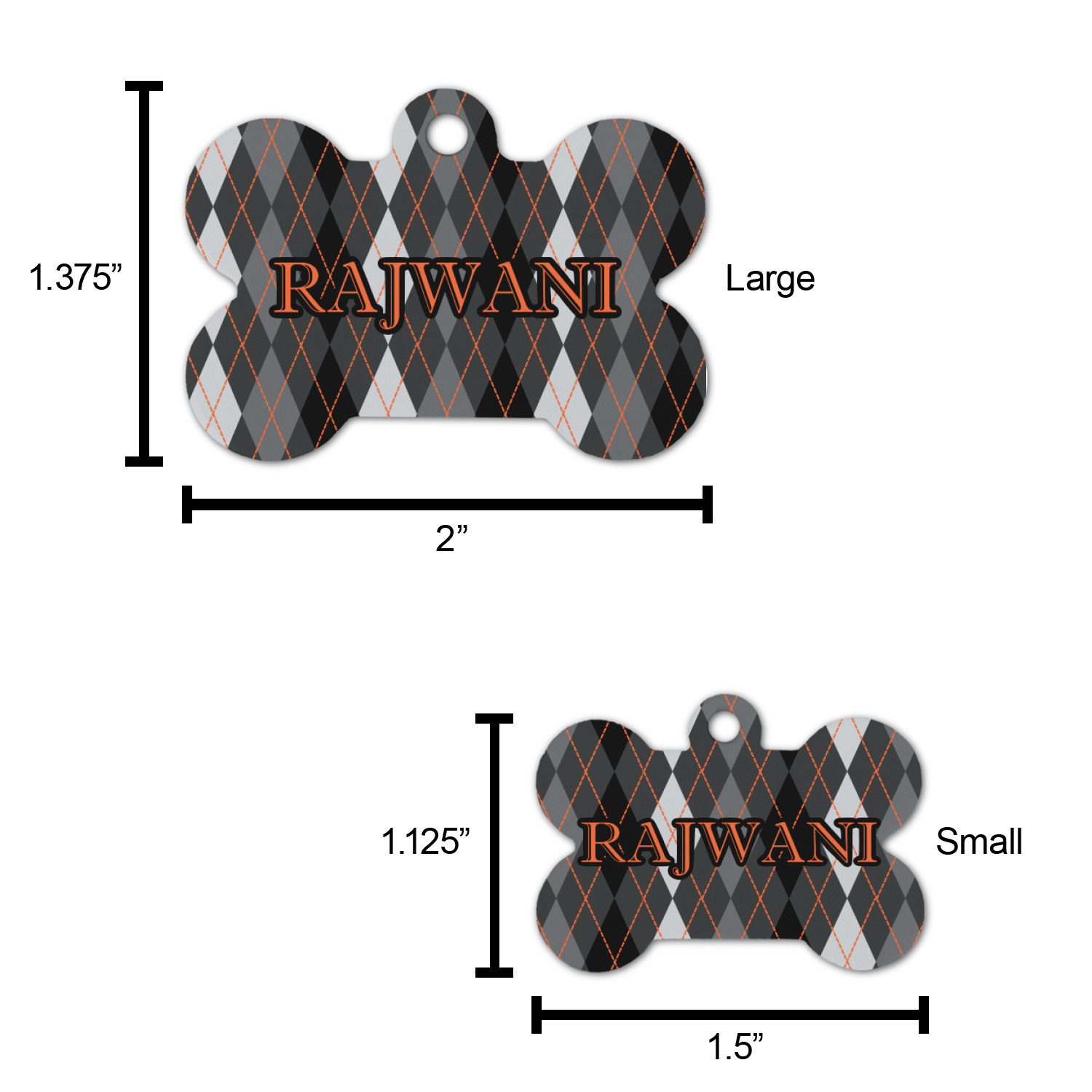The small bone dog tag size is perfect to pair with our small dog collars, the large size pairs well with our large dog collars.