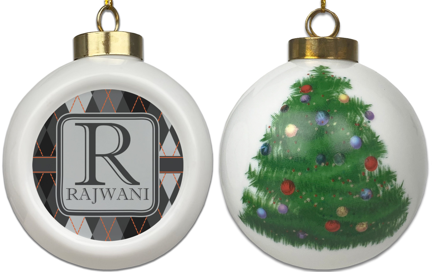 Our Christmas ornaments are a unique ceramic ball shape with a twist as it has a flat face to display your custom design! Select from one of our two design types - Christmas Tree or Poinsettia Garland - to adorn the curved back of your personal design. Each ornament measures 3H x 2.5W x 2D accompanied with a gold string accent for finishing touches to hang on your beautiful Christmas tree!