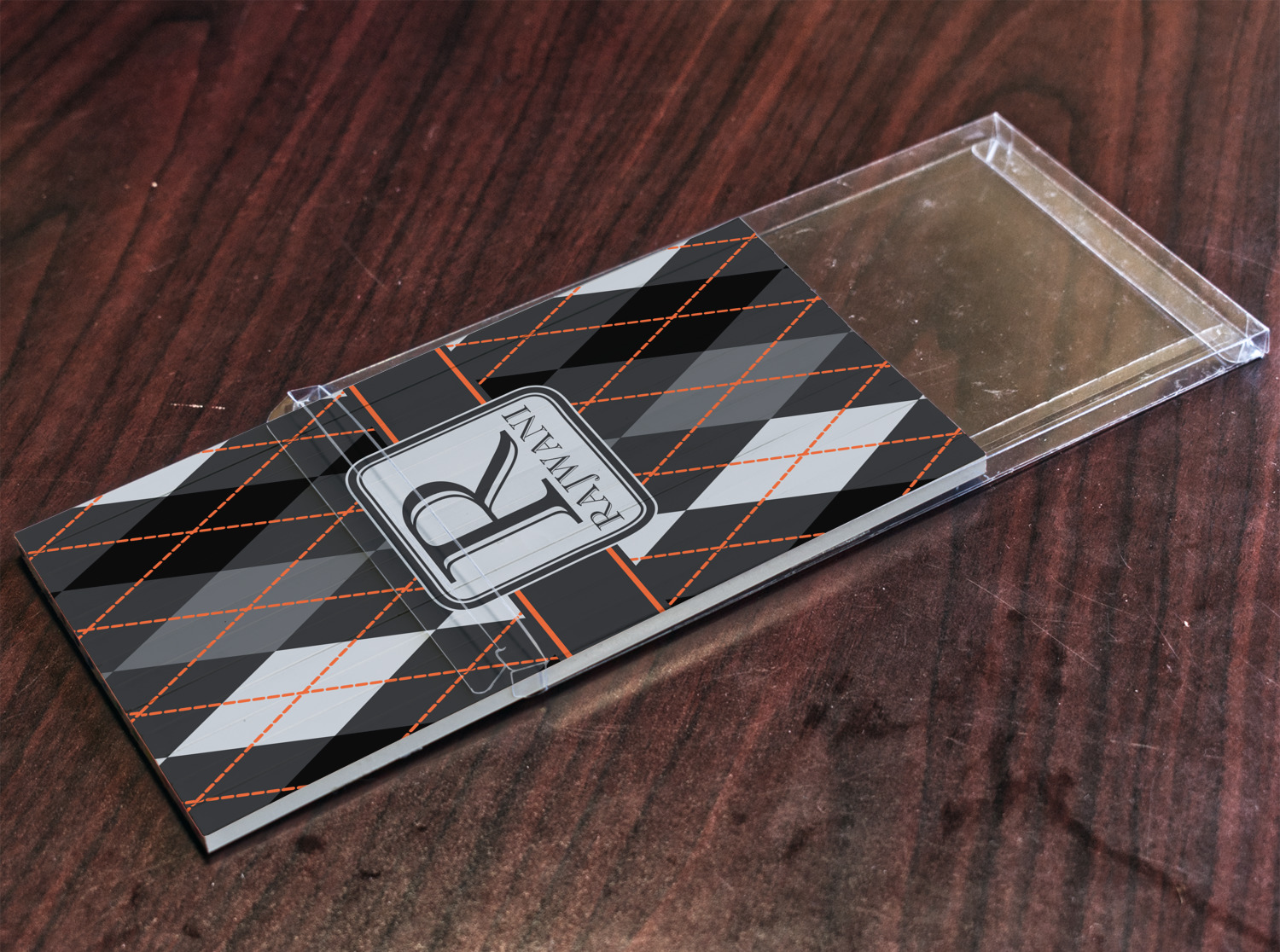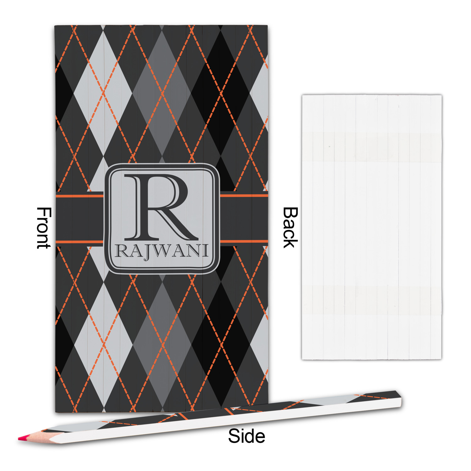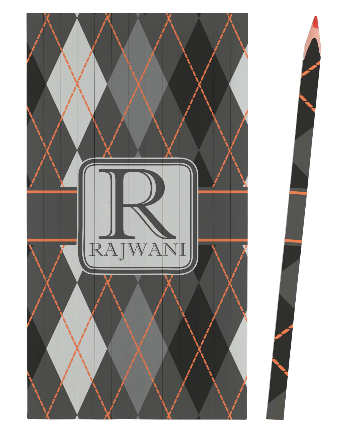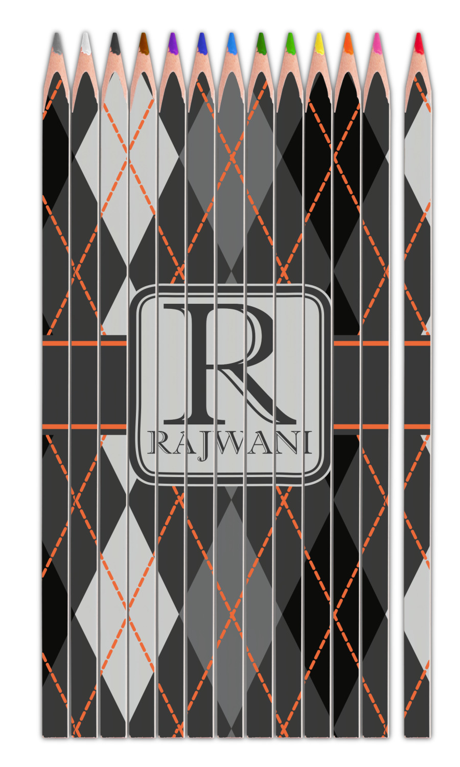 A wide charcoal gray band trimmed in orange divides the pattern to add interested and is used to highlight the slate grey square label. Add personalization of your choice.