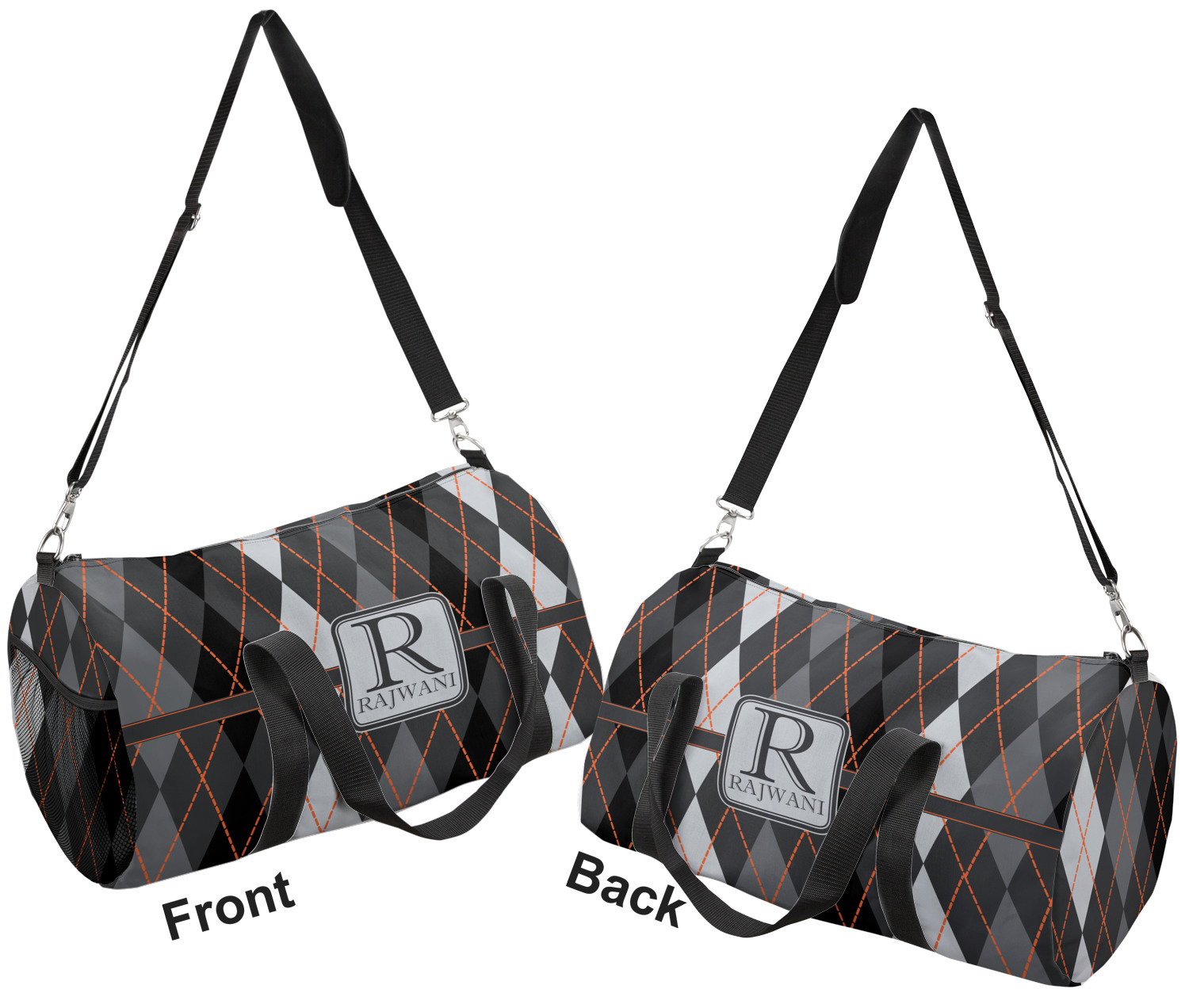 This duffle is a sturdy bag made of a canvas material. It comes in two sizes: Small (19"W x 9.5"H x 9.5"D) and Large (23"W x 12"H x 12"D). The bag is a cylindrical shape with a black adjustable strap and two handles. On one side is an elastic pouch to put a waterbottle or other small item. Your product will be sublimated with your design and is able to be designed on the front, back, and sides. Be sure to remember that the straps may cut into parts of your design if you upload your own artwork.