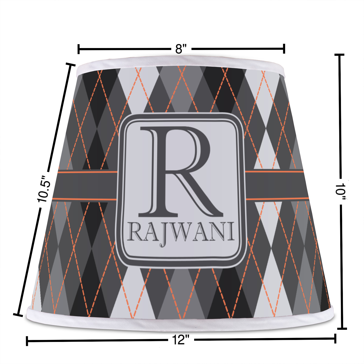 The base of this lampshade is 12 inches in diameter, and the top spans 8 inches in diameter. The total height of the lampshade is 10 inches. The angled nature of this custom lampshade concentrates the light, making it ideal for smaller spaces. This lampshade is made of matte, polyfilm, and displays your customization in its middle. The top and bottom of this colorful lamp shade are lined with a white fabric ribbon (which can be replaced with black inside the design studio) which frames your design and creates a sophisticated finish. As an UNO fitter lampshade, this unique lamp shade will fit a variety of bases.