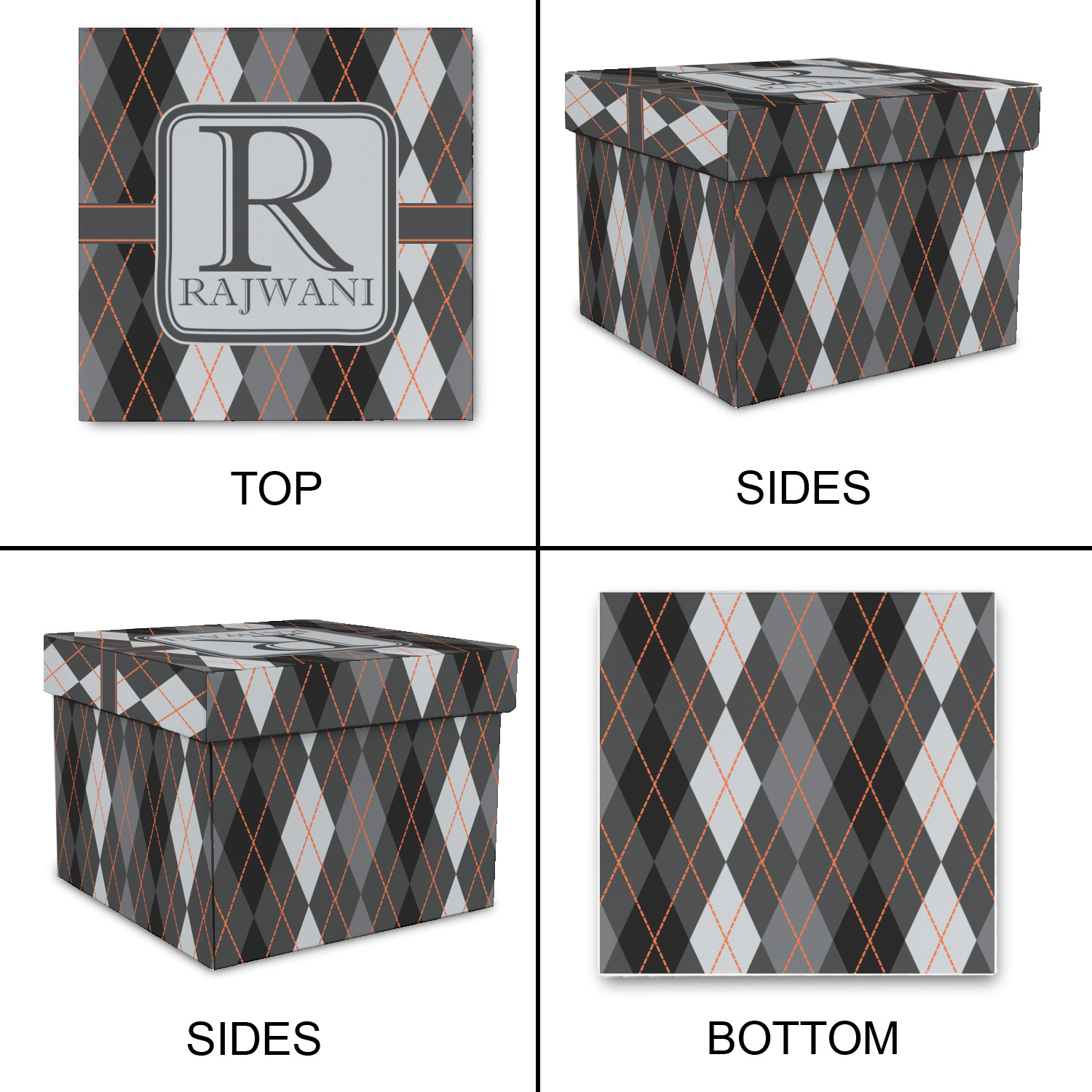 A wide charcoal gray band trimmed in orange divides the pattern to add interested and is used to highlight the slate grey square label. Add personalization of your choice.