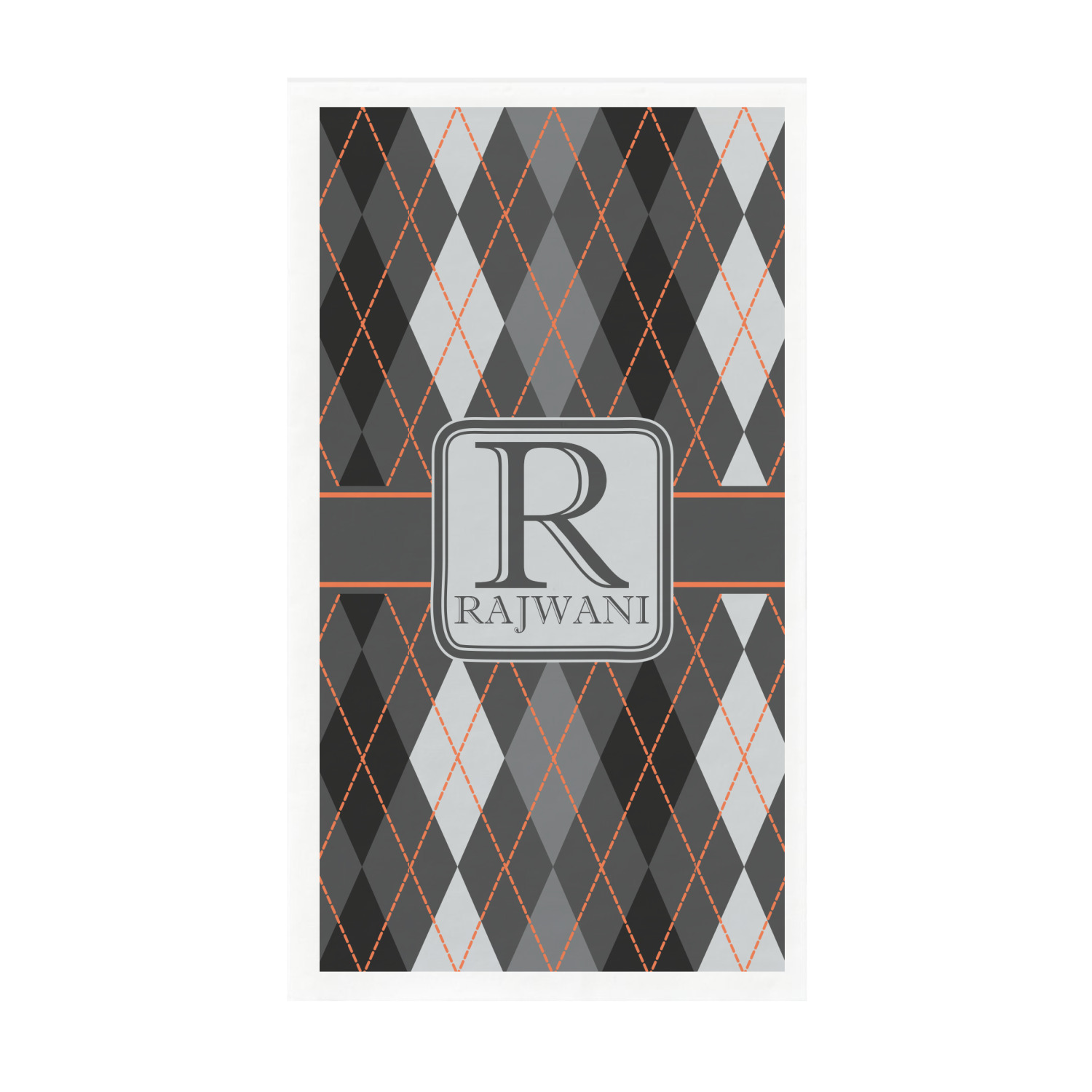 A wide charcoal gray band trimmed in orange divides the pattern to add interested and is used to highlight the slate grey square label. Add personalization of your choice.