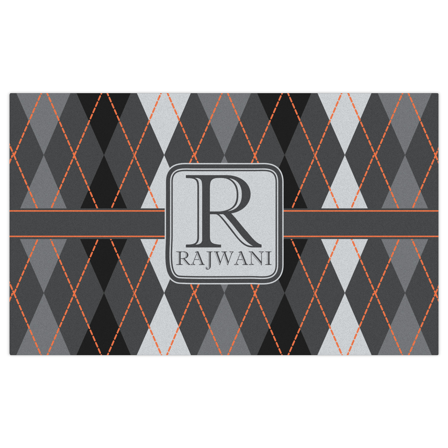 A wide charcoal gray band trimmed in orange divides the pattern to add interested and is used to highlight the slate grey square label. Add personalization of your choice.