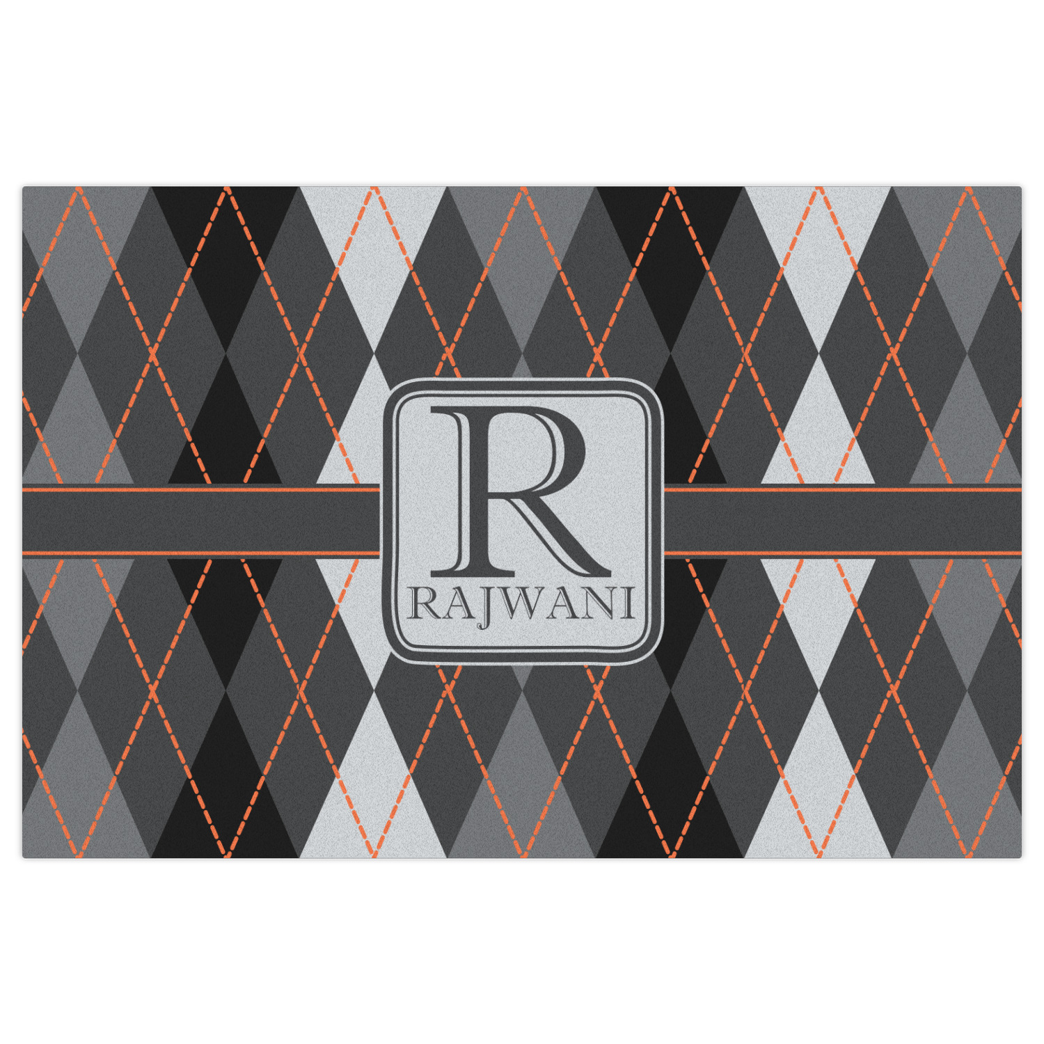A wide charcoal gray band trimmed in orange divides the pattern to add interested and is used to highlight the slate grey square label. Add personalization of your choice.