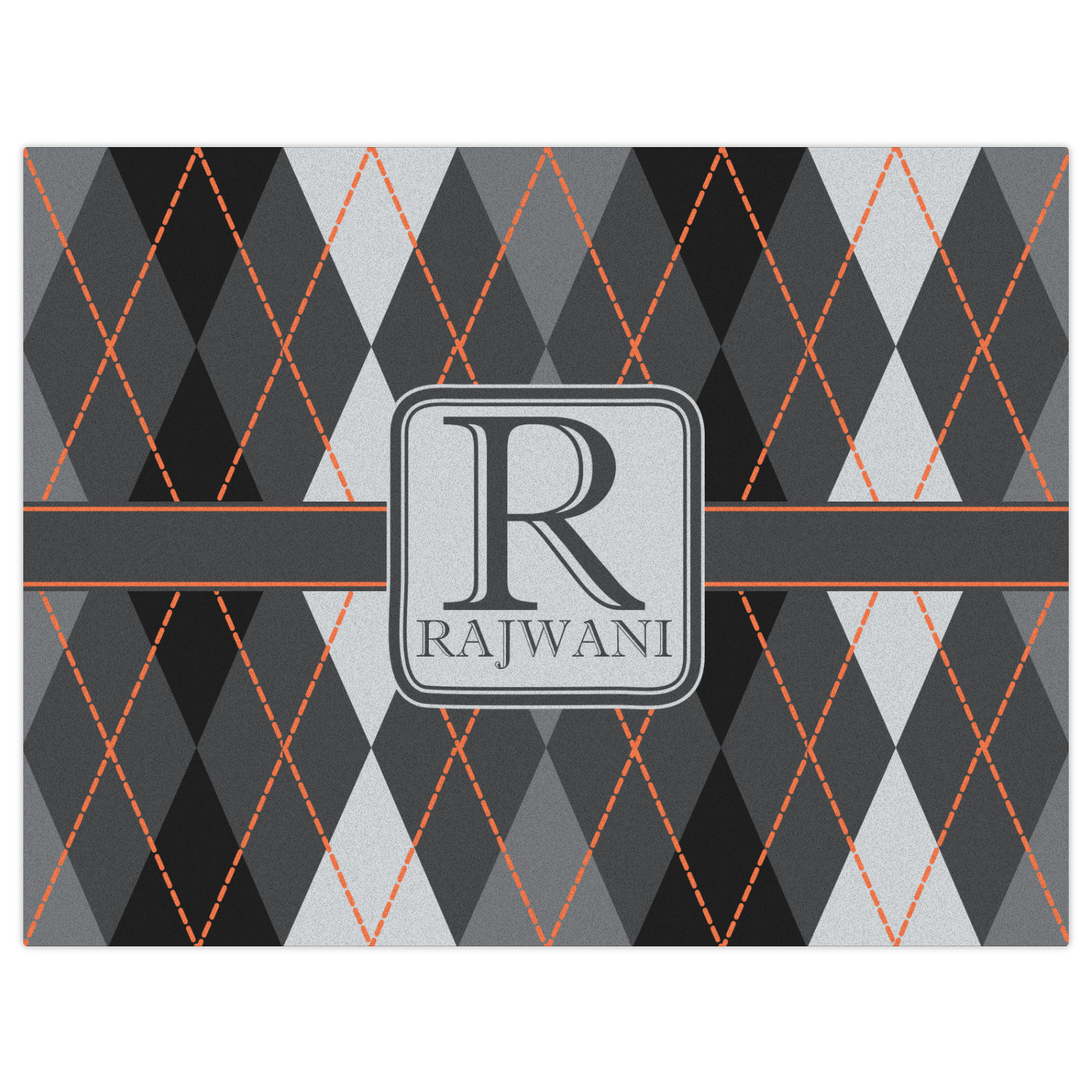 A wide charcoal gray band trimmed in orange divides the pattern to add interested and is used to highlight the slate grey square label. Add personalization of your choice.
