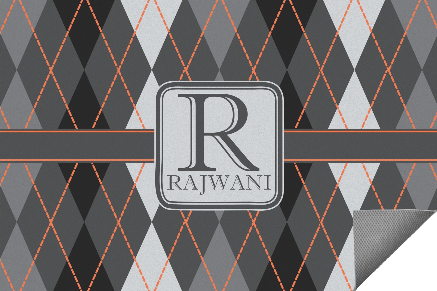 A wide charcoal gray band trimmed in orange divides the pattern to add interested and is used to highlight the slate grey square label. Add personalization of your choice.