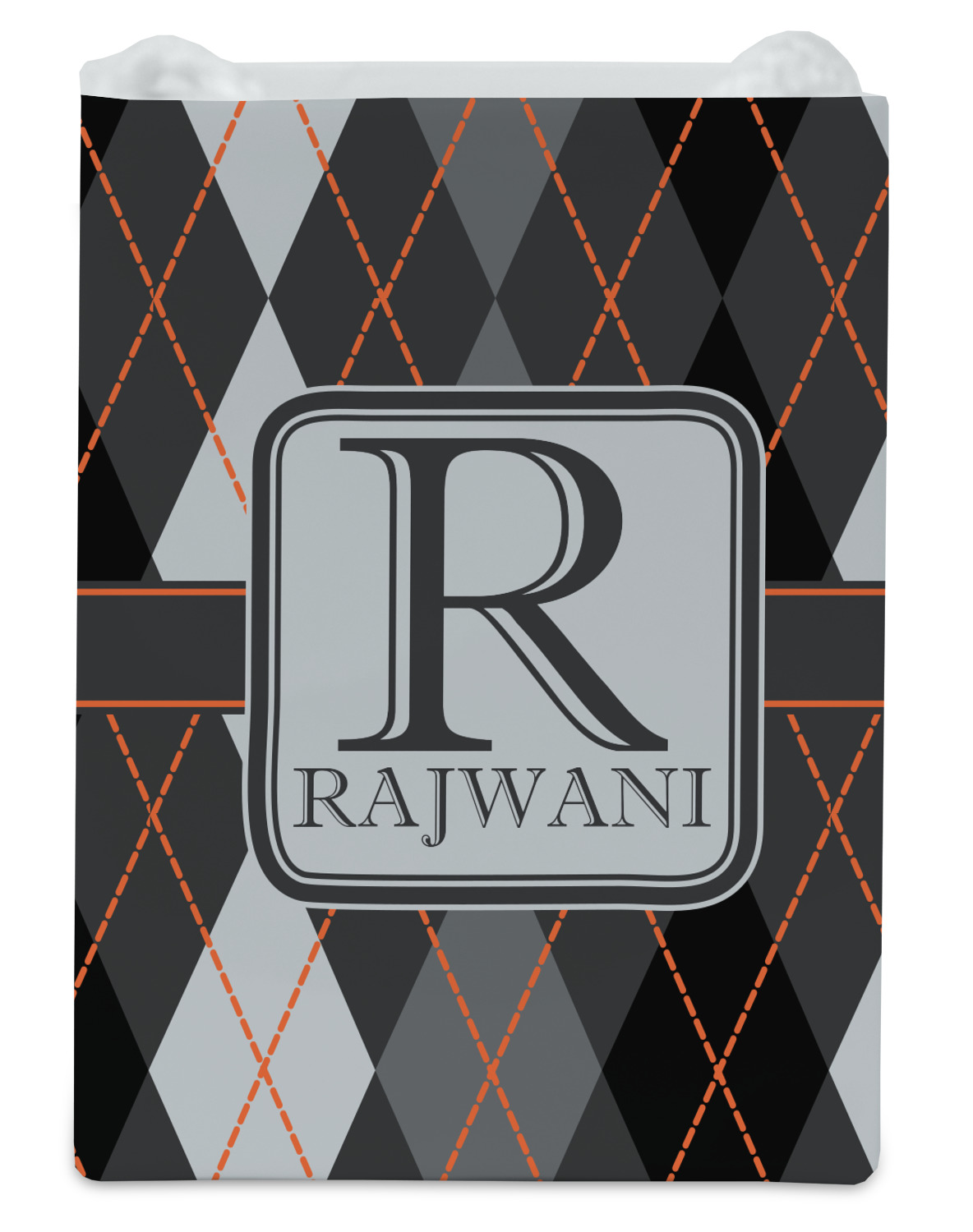 A wide charcoal gray band trimmed in orange divides the pattern to add interested and is used to highlight the slate grey square label. Add personalization of your choice.