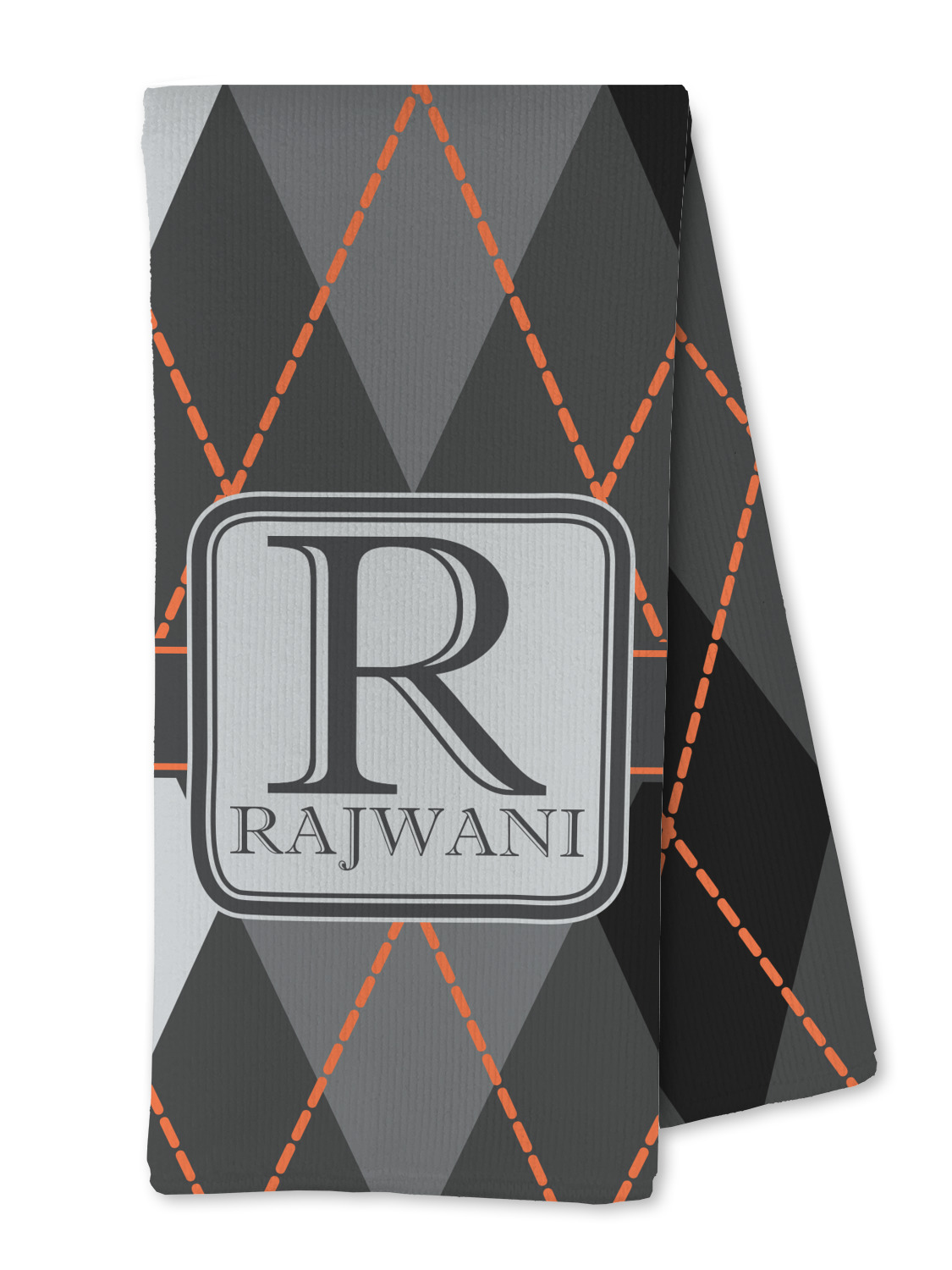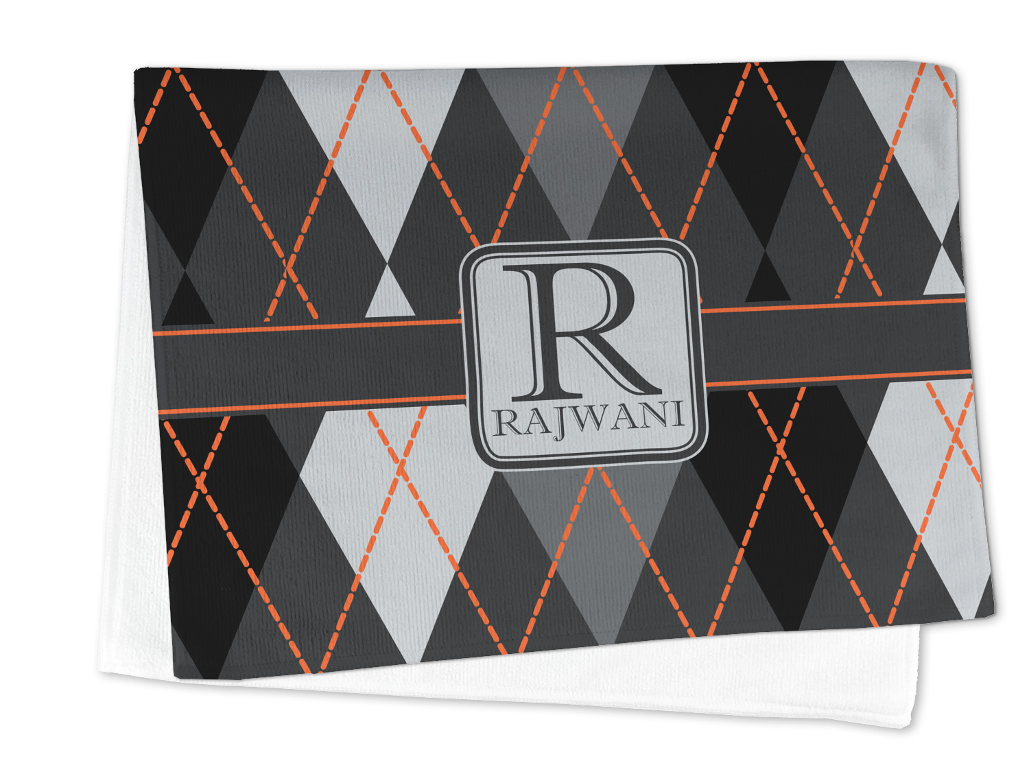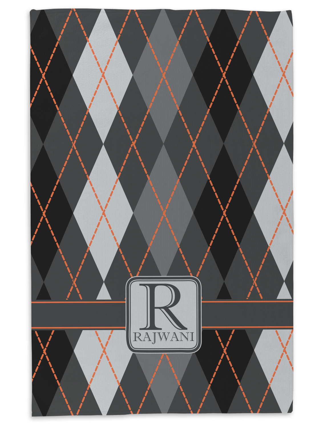 A wide charcoal gray band trimmed in orange divides the pattern to add interested and is used to highlight the slate grey square label. Add personalization of your choice.